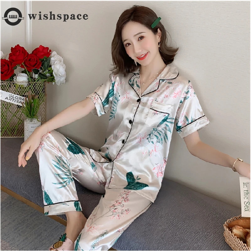 Цветочный Шелковый пижамный комплект, Женская атласная одежда для с...
