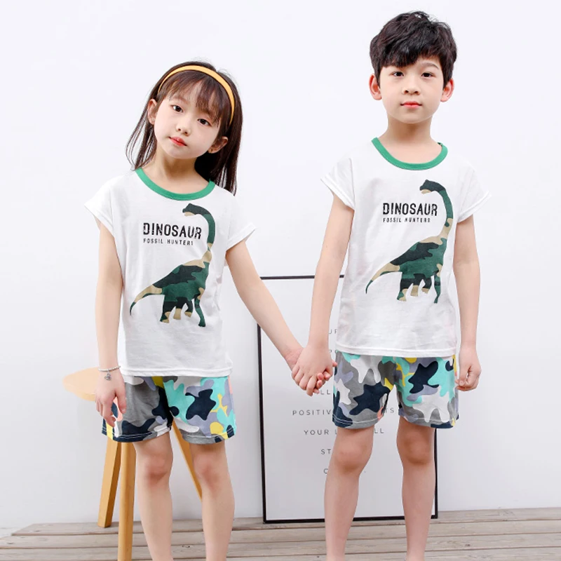 Детские пижамы, летний комплект одежды для мальчиков и девочек, летние топы + короткие штаны, одежда для сна с мультяшным динозавром, хлопковые детские пижамы