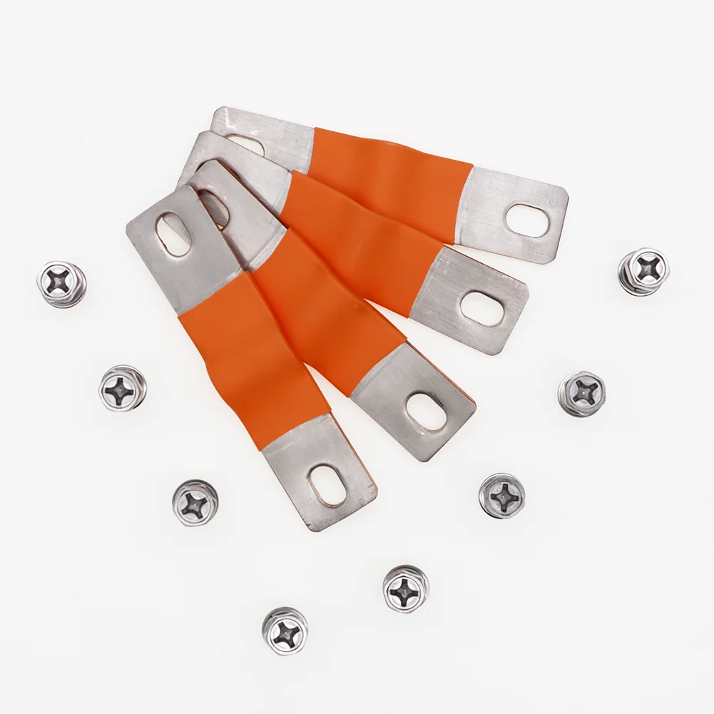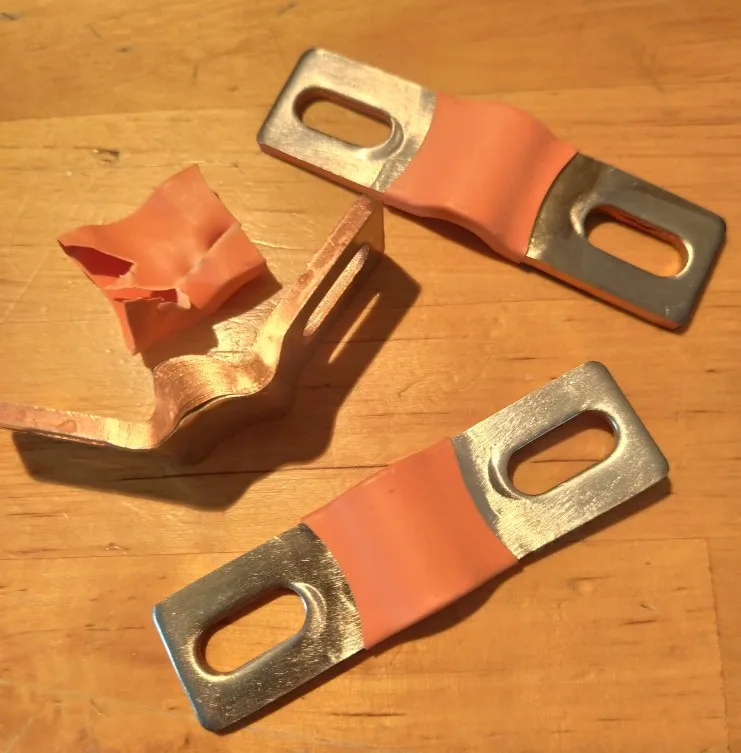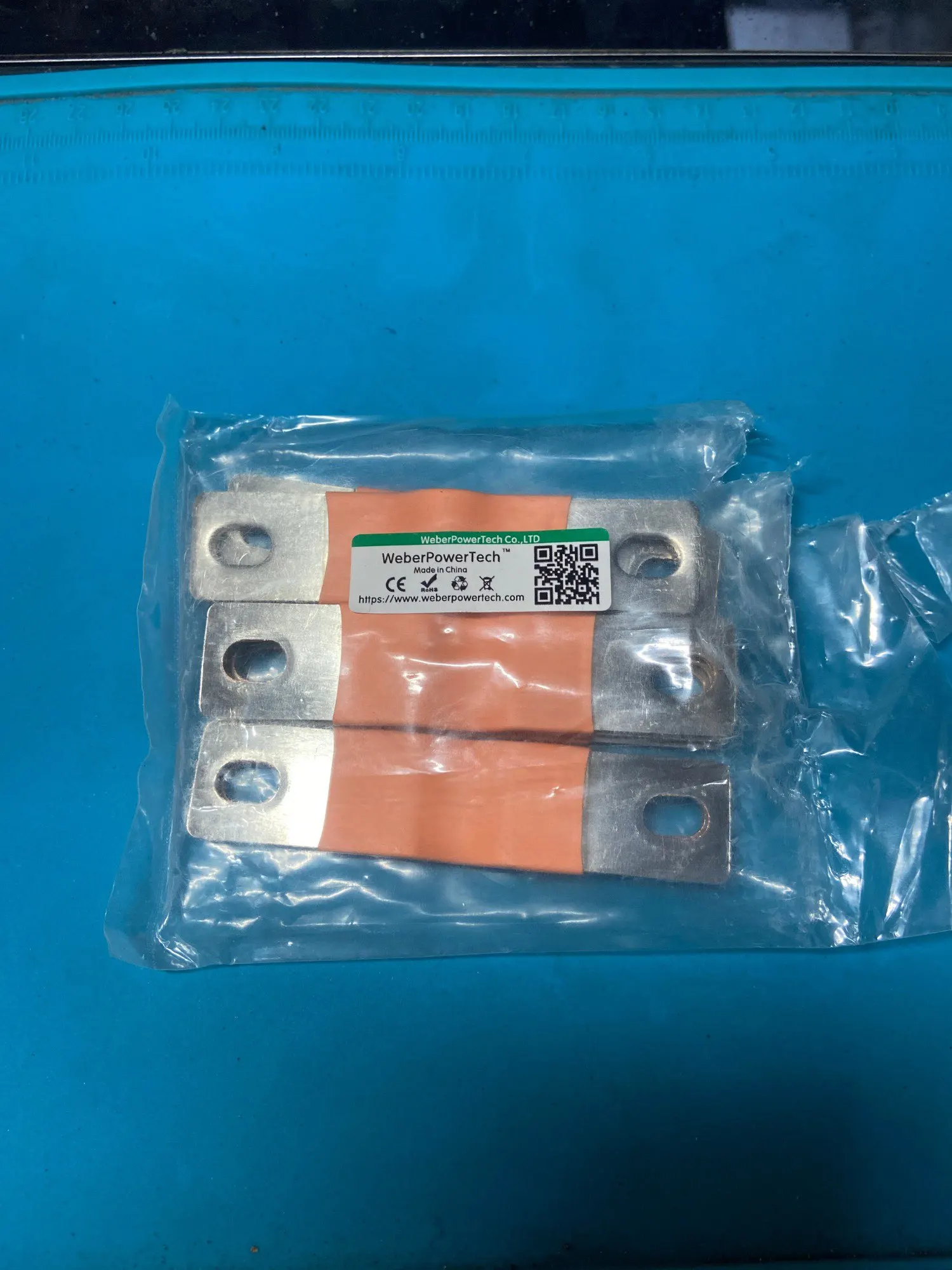 Привет, всем! Клеммы выполнены очень хорошо. Сделаны из шести медных пластин толщиной 0.5mm. Анодирование только (верх/низ). Концы прессованные, а середина (под изоляцией) послойная. Гнуться как хочешь, да и компенсацию на расширение дадут. Проще сразу проложить между аккумуляторами (верх/низ) 4mm прослойку (демпфер), после этого- закрепить шины в рабочее положение. Между банками, прослойку (диэлектрическую 0.5mm) хватит, это просто доп. защита. Рекомендую к покупке.