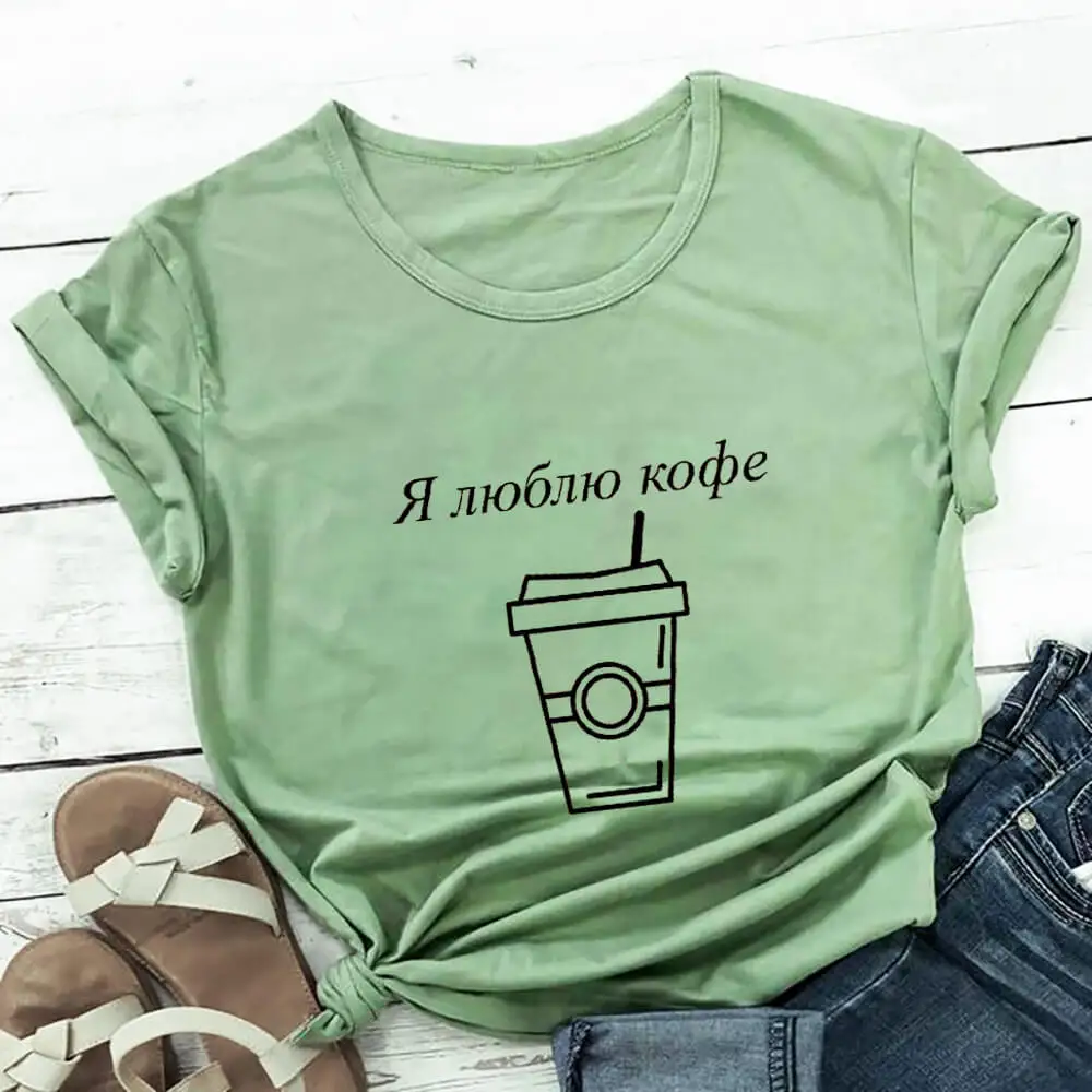 Я люблю кофе Женская футболка из 100% хлопка с русской кириллицей забавная летняя повседневная футболка унисекс с круглым вырезом футболка с короткими рукавами и надписью