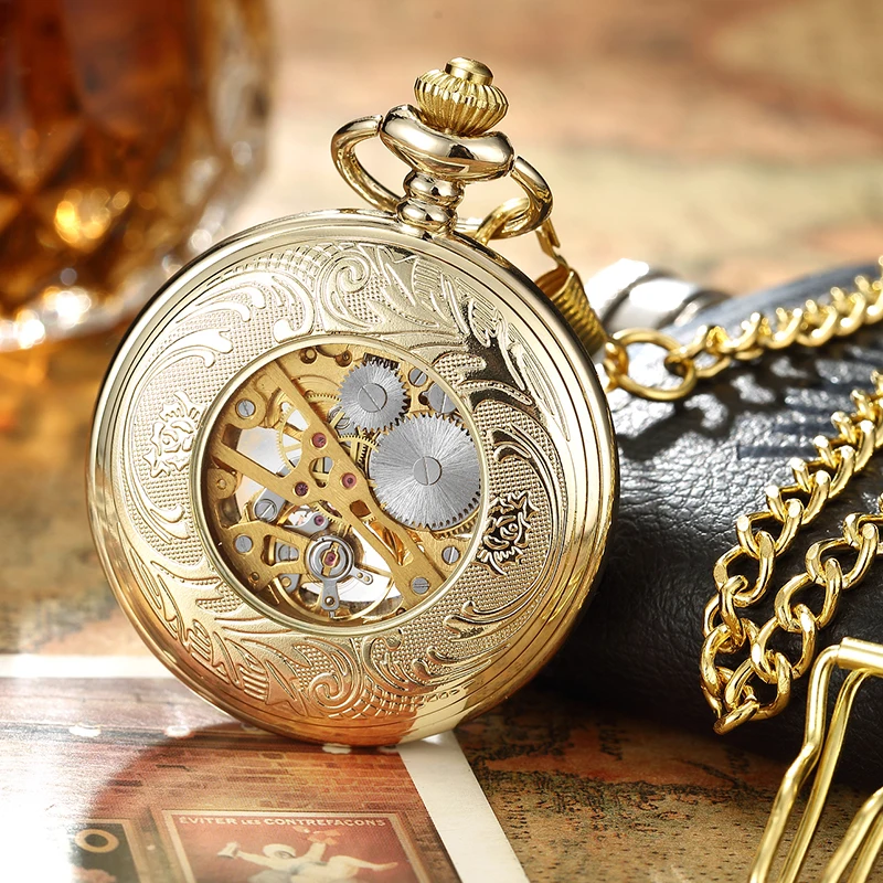 Карманные механические часы-скелетоны мужские, золотистые, со стальной скульптурой, в стиле ретро