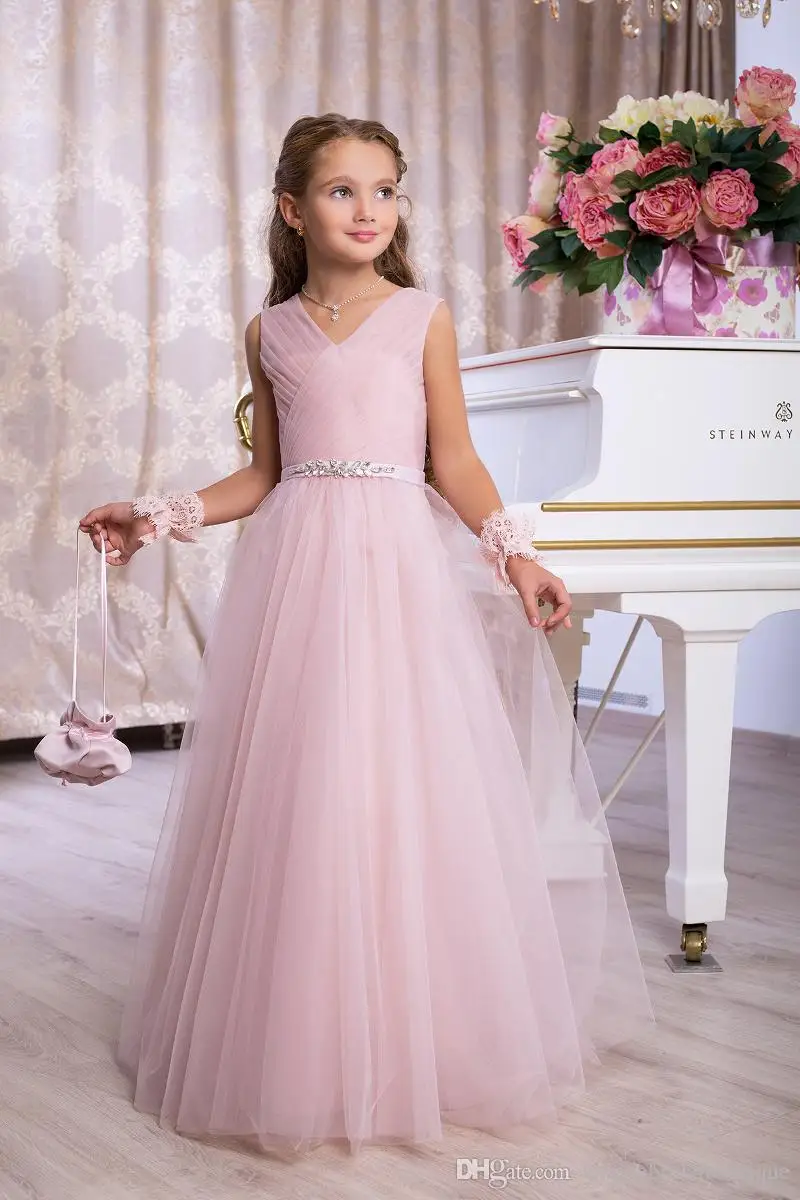 Светильник-голубые и розовые платья для маленьких девочек, официальная одежда для праздника, плиссированные длинные платья подружки невесты с V-образным вырезом и милыми цветами, 2019