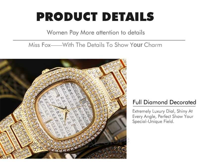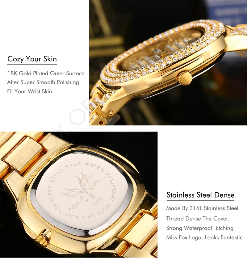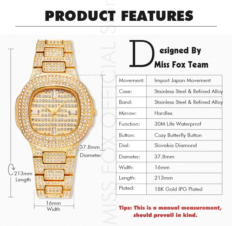 MISSFOX Iced Look браслет Rolly хип-хоп металлические часы Элегантные часы Baquette Time Indicators Master Bling дизайнерские женские часыСтиль: роскошный-Большой алмаз-100% новый и высокое качество.-Точный кварцевый механизм для точного сохранения времени.-30 м Водонепроницаемость (не для душа и плавания), ударопрочность-18K золото нано вакуумное покрытие, золотой цвет не выцветает.-Ватенлайн, рождественский подарок, отжиг, вечерние, день рождения, одежда для свиданийХарактеристики (прибл.):Чехол диаметр: 3,78 см прибл.Чехол Толщина: 1,0 см прибл.Материал корпуса: нержавеющая сталь 316LГруппа Ширина: 1,6 смДлина ремешка: около 21,30 смМатериал ремешка: нержавеющая сталь 316LРегулируемый ремешок: Да, может быть продлен, свяжитесь с нашей Золотой службой поддержки клиентовПосылка включает в себя:Оригинальные часы MISSFOX-1 шт.