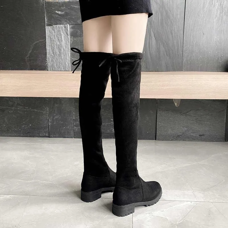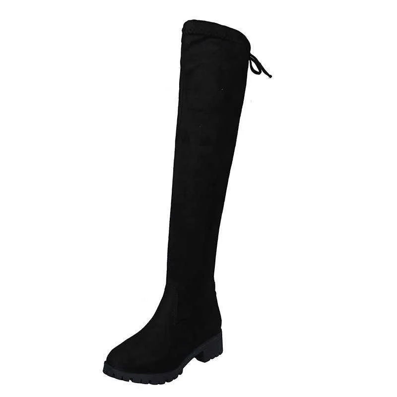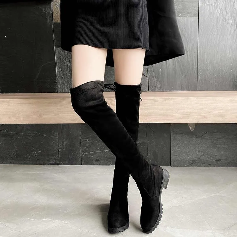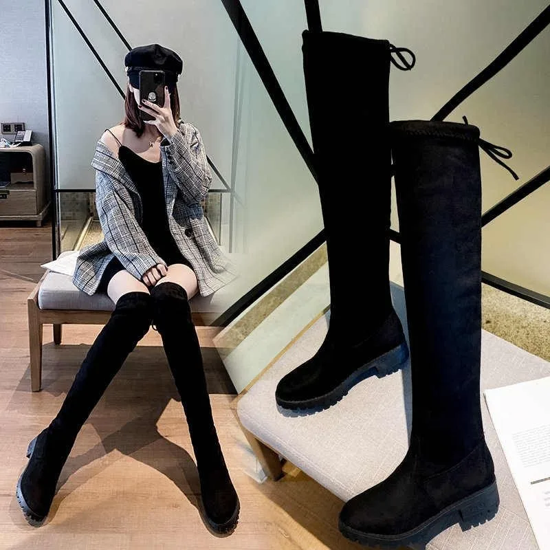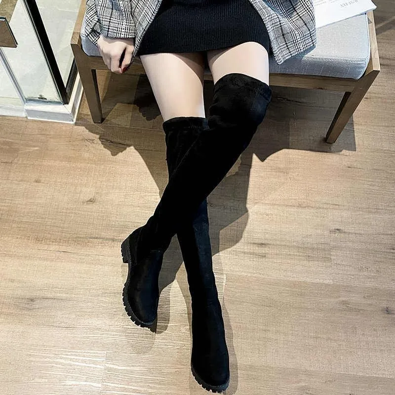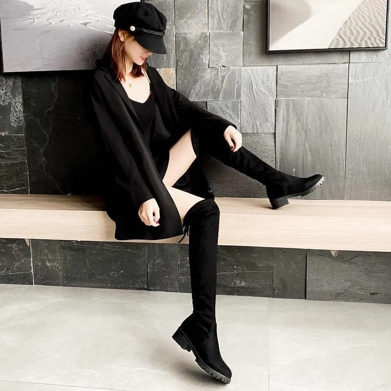 2021 эластичные сапоги выше колена из искусственной замшевые чулки ботфорты толстый каблук; Черные; Botas; Стретчевые длинные штаны женские сапоги, обувь