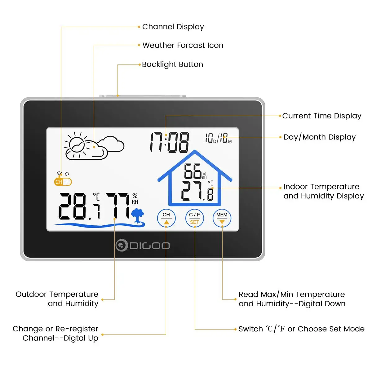 Digoo DG-TH8380 Беспроводной сенсорный экран, для использования вне помещения с погодной станцией погоды Сенсор термометром и гигрометром декоративные часы для метр календарь Подсветка