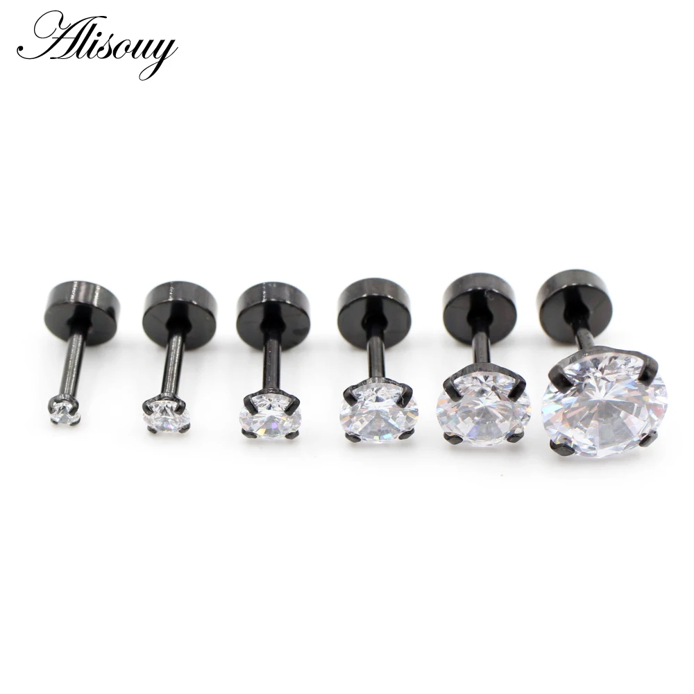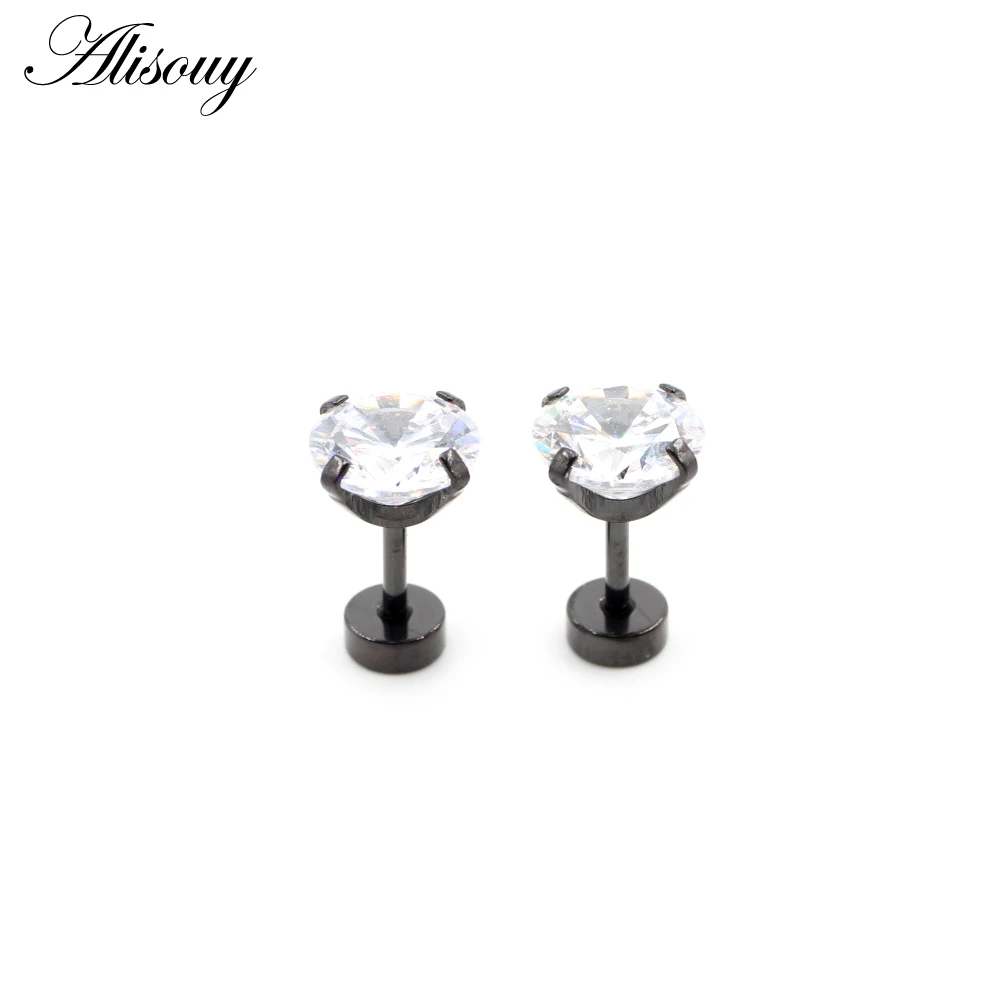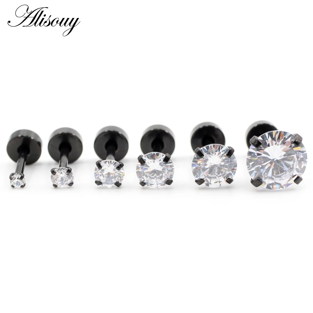 Alisouy 2 шт черный дверные ручки из нержавеющей стали для мужчин и женщин 4 зубец круглая с украшением в виде кристаллов циркон серьги штифты Серьги Ушной Хрящ Пирсинг ювелирные изделия