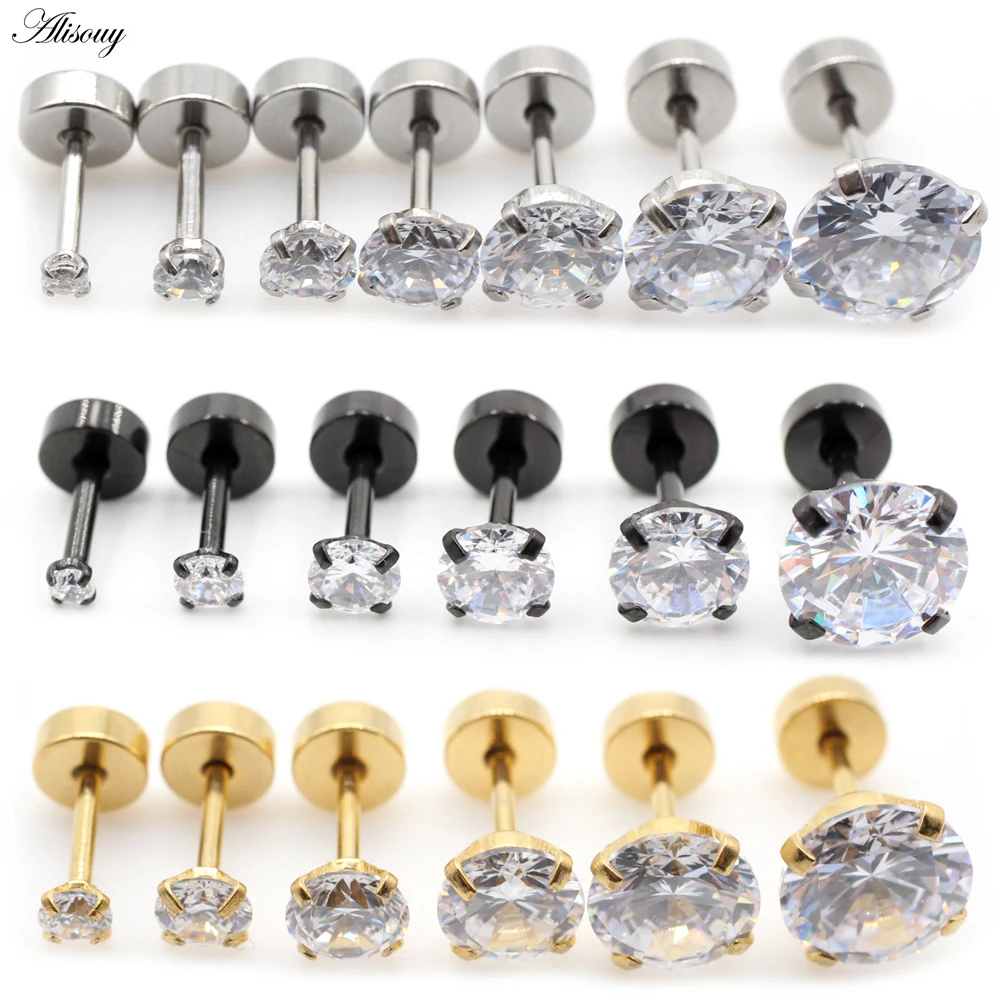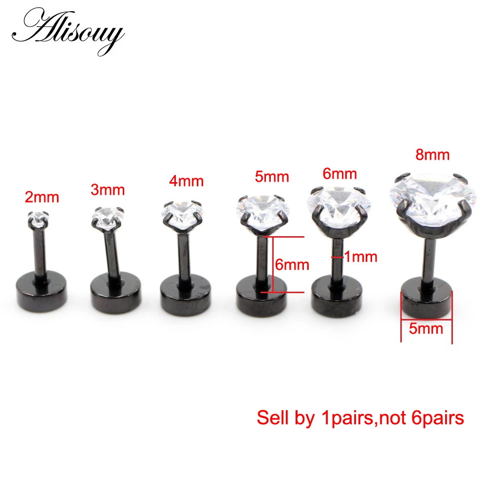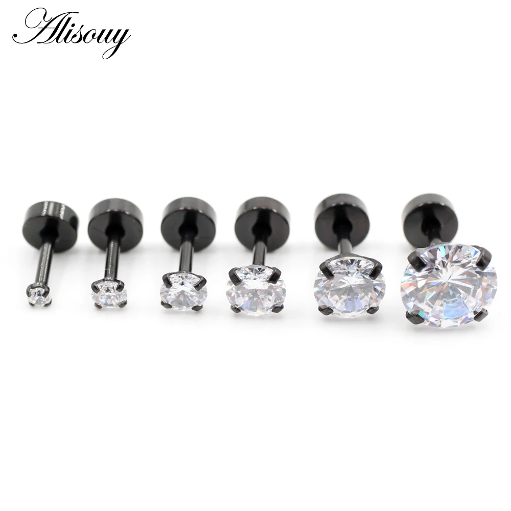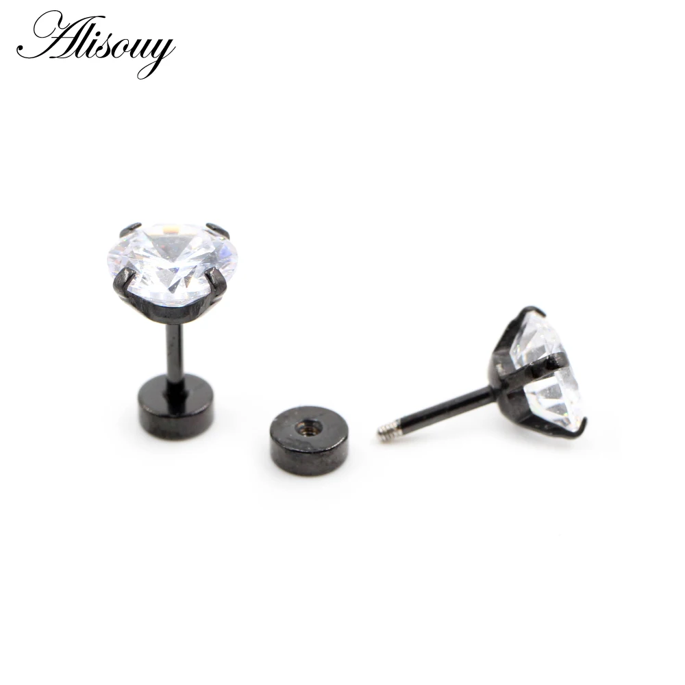 Alisouy 2 шт черный дверные ручки из нержавеющей стали для мужчин и женщин 4 зубец круглая с украшением в виде кристаллов циркон серьги штифты Серьги Ушной Хрящ Пирсинг ювелирные изделия