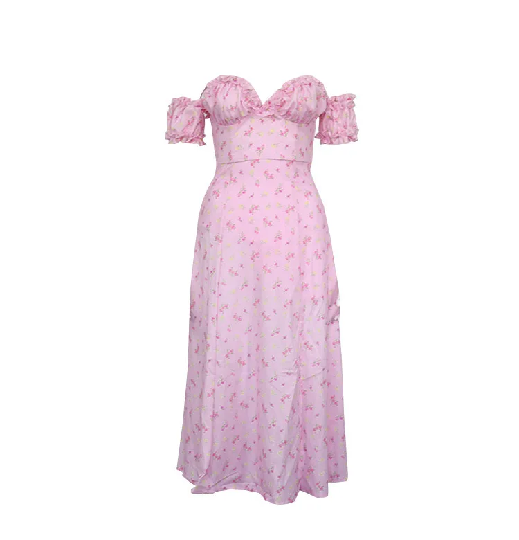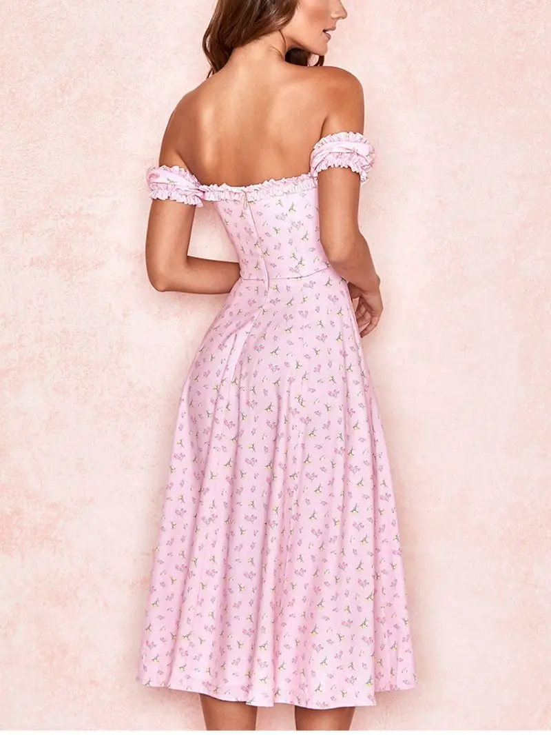 Женское летнее платье, элегантное розовое платье с цветочным узором, открытыми плечами, открытой спиной и разрезом, милое романтичное платье, модные женские платья, 2021