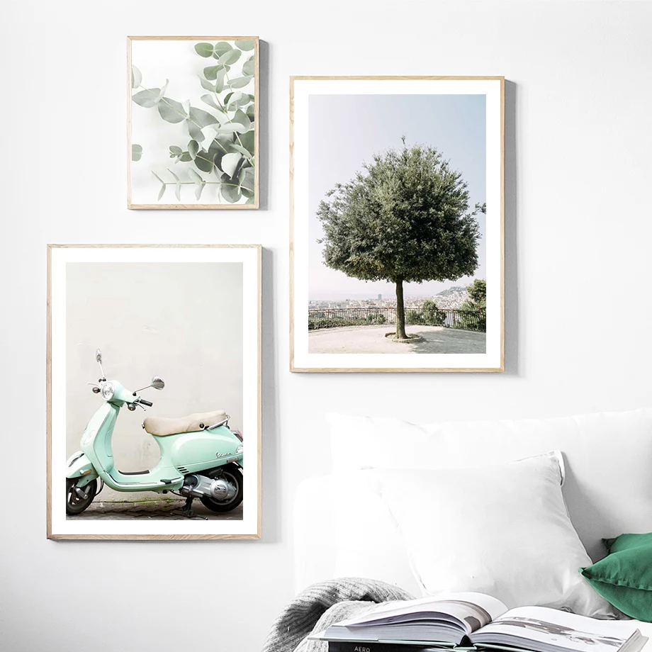 Ретро Автомобиль Велосипед Пальма зеленый лист стена искусство холс...