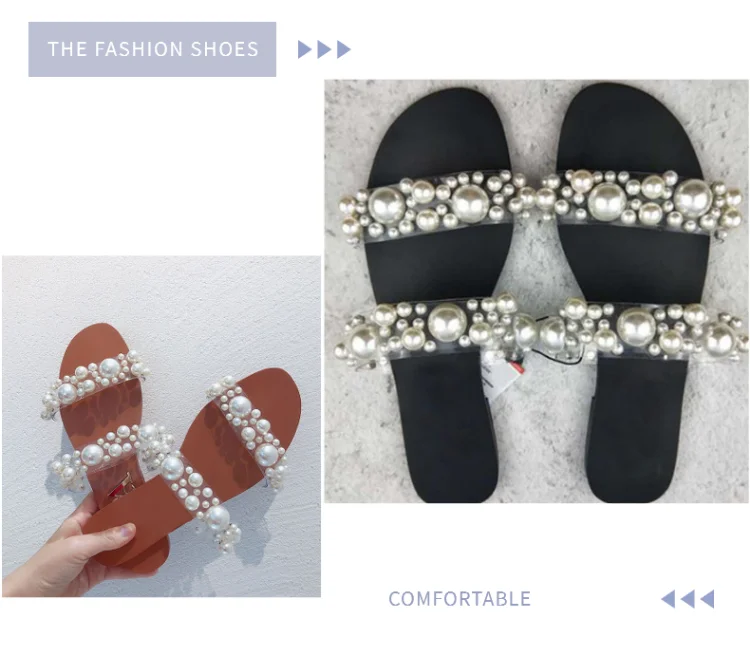2021 женские богемные шлепанцы с жемчугом; Сандалии на плоской подо...