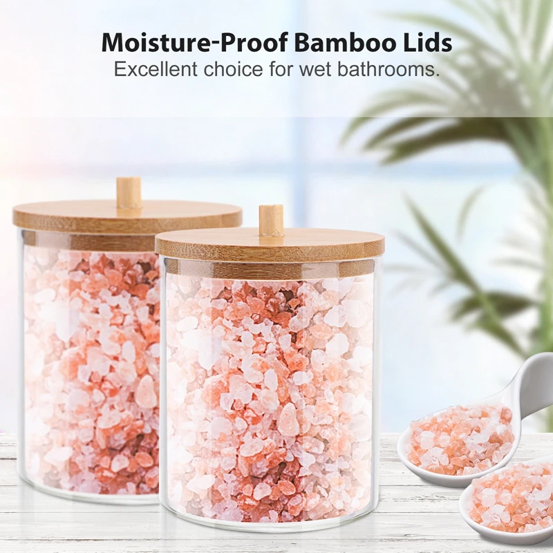 Эти баллоны для ванной выглядят как стекло, но они более устойчивы к падениям, чем стекло. Вам не придется беспокоиться о том, что они сломаются. Дизайн бамбукового чехла выглядит более продвинутым, более идеально подходит для домашнего декора. Влагостойкая бамбуковая крышка идеально подходит для ванной комнаты с держателем q, которая является пыленепроницаемой и водонепроницаемой.