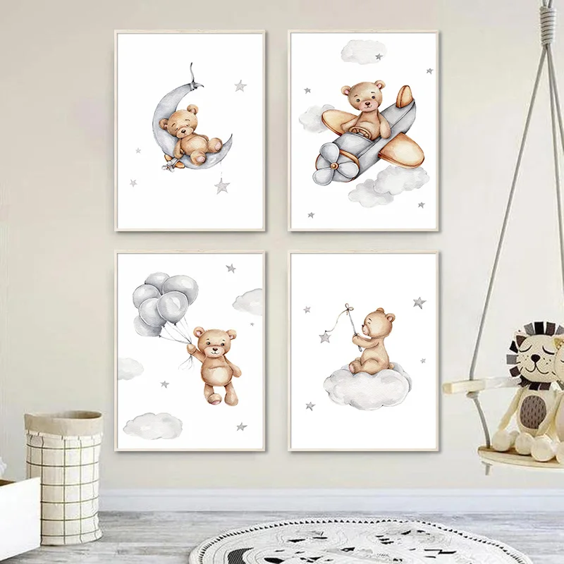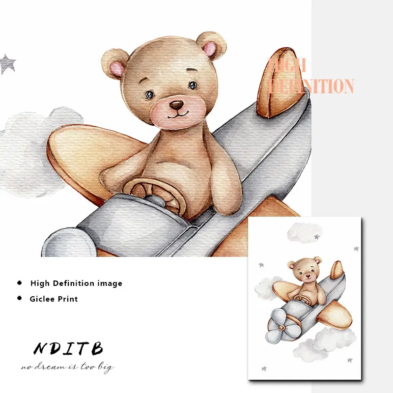 С симпатичным мишкой, самолетом, Moon Холст плакат для детской арт живопись для детской комнаты с мультяшным принтом СТЕНА картина северных детская Спальня украшения