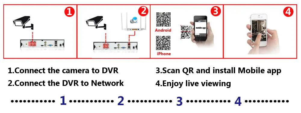 Простая настройка, всего 4 шага для просмотра мобильный телефон, просмотра видео в режиме реального времени из любого места и в любое время с помощью смартфона, стола или ПК с передовой технологией P2P, вы можете получить удаленный доступ к вашей системе за считанные минуты или меньше, нет необходимости в переадресации, удаленный доступ никогда не был таким простым