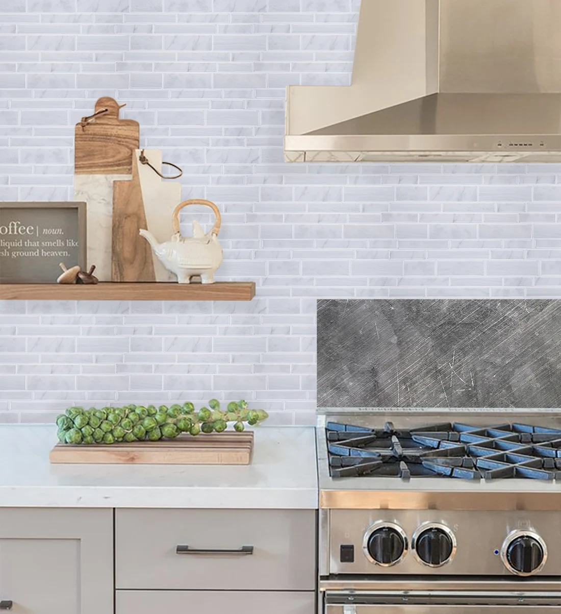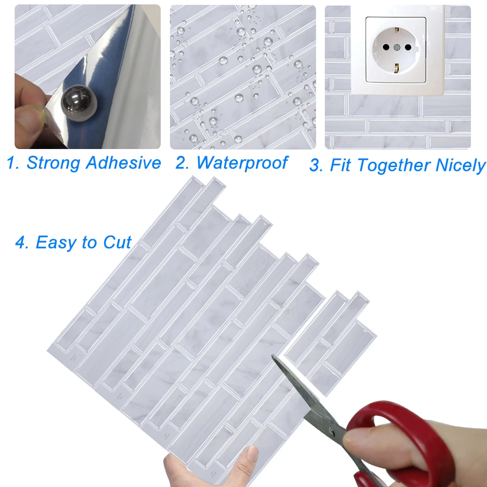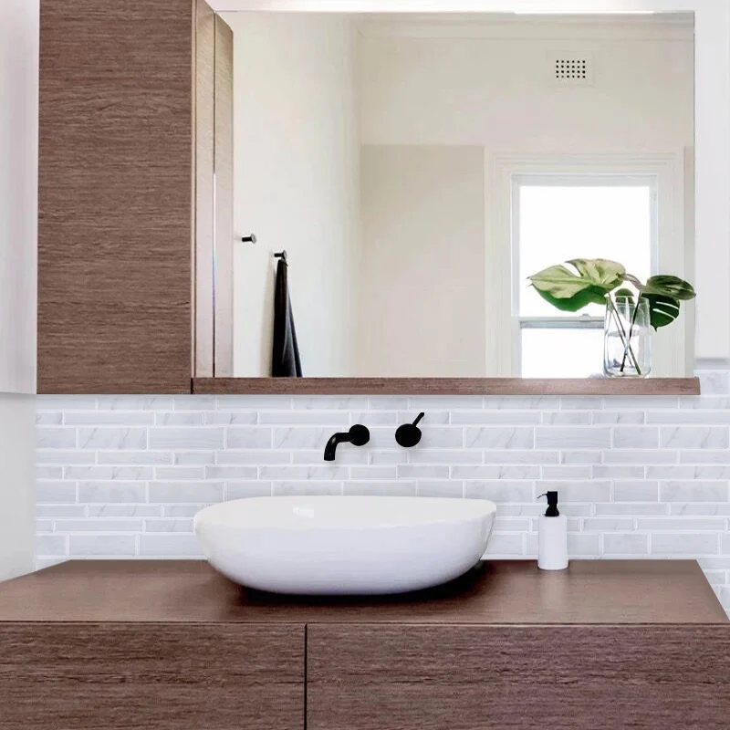 Плитка может быть легко установлена непосредственно над существующими панелями или гладкой поверхностью. Специально разработанная для кухни и ванной, плитка устойчива к нагреванию плиток и влажности ванных комнат.