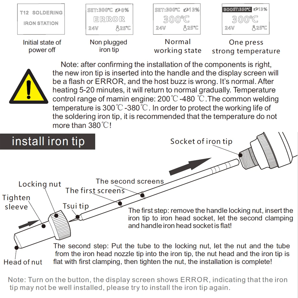 Примечание: железный наконечник не работает непрерывно при высокой температуре, высокотемпературная работа легко повредить наконечник! Обычная температура плавления припоя 183 °C, бессвинцовая температура плавления припоя 227 °C, обычно температура сварки 300-380 °C, 380 °C-это температура разделительной линии, выше 380 °C, окисление и потеря железной головки чрезвычайно быстрые, серьезно влияют на срок службы нагревательного сердечника, дисплей температуры выше 380 °C будет биться, Чем выше температура, тем выше удар! Рекомендуется при температуре 300-380 ° C для сварочных работ, большая часть работ может быть выполнена, температура при ударе является нормальной, не влияет на использование! Паяльник, используемый в этой паяльной станции, является совершенно новым наконечником паяльника. Из-за нестабильного сопротивления нового наконечника паяльника температура будет скакать или отклоняться, что является нормальным. После нескольких раз использования стабильность постепенно стабилизируется. Если вы возражаете, пожалуйста, не покупайте. Функция и преимущество 1. Быстрый нагрев и контроль температуры точный 2. Автоматический Режим сна и автоматическое отключение питания 3. Поднимите ручку, чтобы разбудить хост 4.получить более высокую температуру, нажав на кодер Вход: AC 110V-240V Источник питания: 24V 4.5A температура: 200C-480C Время плавления олова:<8s