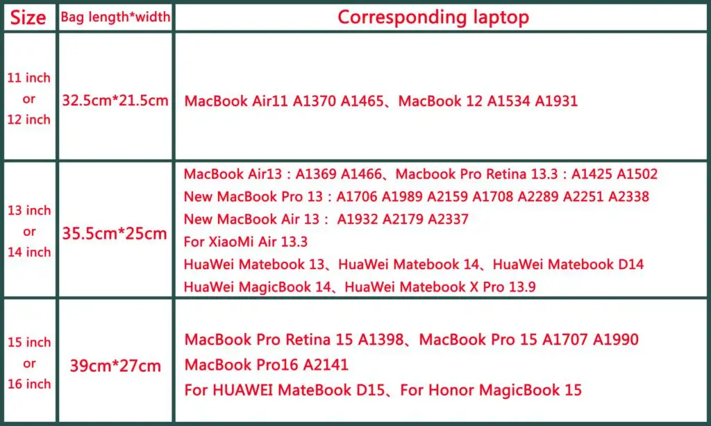 Примечание: Внутренний размер каждой стороны всех сумок для ноутбуков на 1-2 см меньше, чем внешний размер