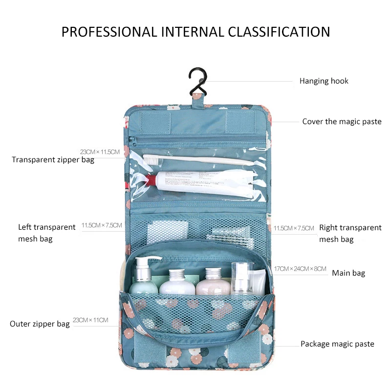 Pocket1: ПВХ карман используется для предметов с водойPocket2: сетчатый карман может использоваться для хранения мелких предметов, таких как косметика и ватные палочки pocket3: основной большой карман может держать большие, тяжелые туалетные принадлежности Pocket4: Основной большой карман имеет небольшие карманы сбоку, чтобы держать плоские предметы pocket5: основной большой карман также имеет небольшой карман на молнии спереди для маленького ТоварыPocket6: есть также карман на задней части сумки, который используется для масок или часто используемых предметов. Есть также ремни с обеих сторон основного кармана, которые можно использовать для фиксации туалетных принадлежностей!