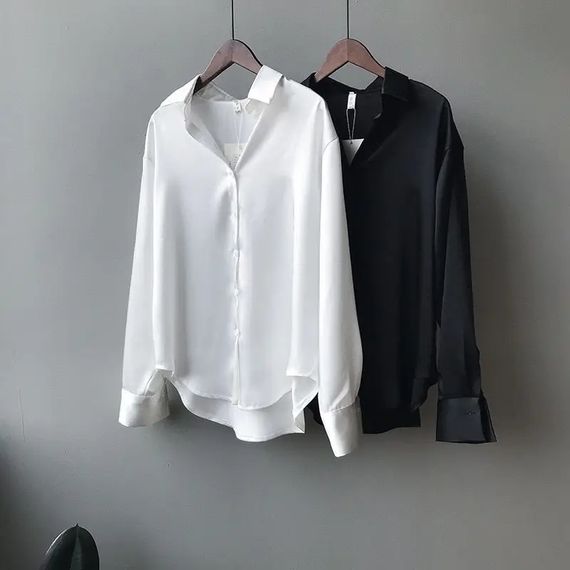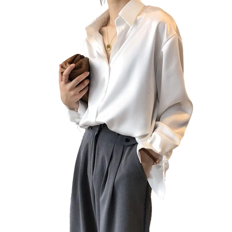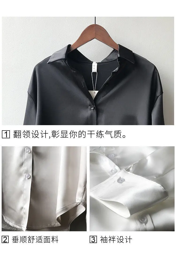 Рубашка женская, шелковая, атласная, белая, весна-лето, 2021