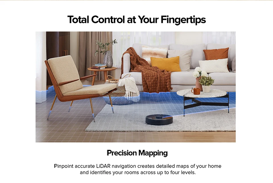 Точная навигация liDAR Pinpoine создает подробные карты вашего дома и определяет ваши комнаты на четырех уровнях.