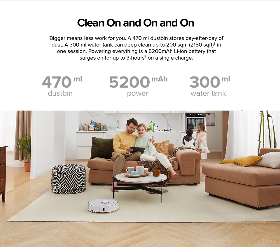 Больше означает меньшую работу для вас. Мусорная корзина объемом 470 мл хранит ежедневное количество пыли. Резервуар для воды объемом 300 мл может глубоко очистить до 200 кв. М (2150 кв. Футов) 6 за один сеанс. Питание-это литий-ионный аккумулятор емкостью 5200 мАч, который включается до 3 часов без подзарядки.