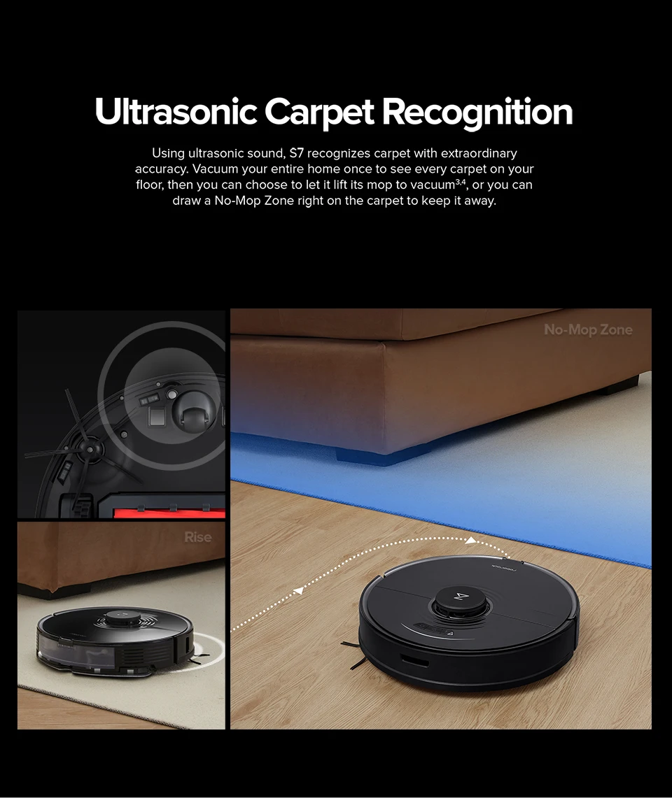 Используя ультразвуковой звук, S7 распознает ковер с исключительной точностью. Пропылесосите вас весь дом один раз, чтобы увидеть каждый ковер на вашем полу, тогда вы можете позволить себе поднять его швабру к пылесосу, или вы можете нарисовать зону без швабры прямо на ковре, чтобы держать ее подальше.