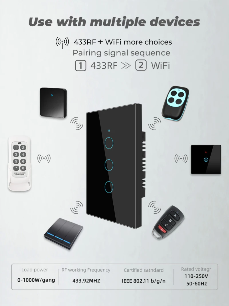 【Четыре метода управления 】 управление через приложение + Голосовое управление + 433 МГц беспроводной переключатель RF + сенсорное управление