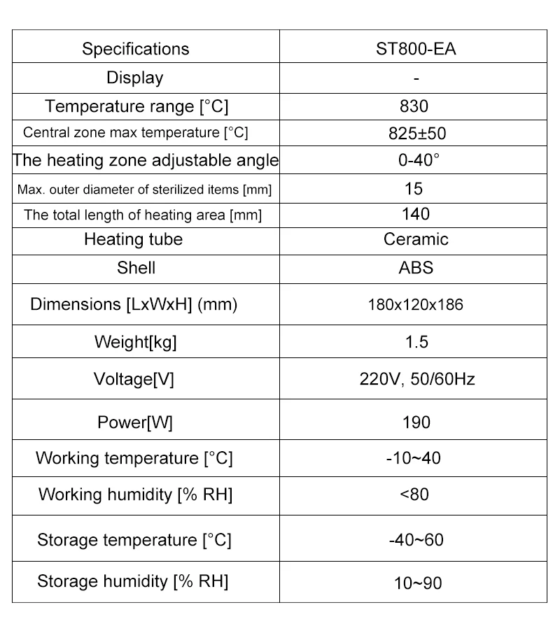 Ключевые особенности• Стерилизаторы DLAB быстродействуют, удобны и могут заменить спиртовые лампы и горелки bunsen• Стерилизация завершена в течение 5-7 секунд• Очень безопасно работать без визуального огня. Он только разбивает органические вещества в глубинах керамического нагревательного корпуса и предотвращает перекрестное загрязнение• Светодиодный дисплей фактической температуры с точностью контроля температуры до 10 °C• Они могут быть использованы в биологических шкафах безопасности и чистом настольном пространстве• Точный контроль температуры и регулировка от 300 до 830 °C• Регулируемый угол зоны нагрева (ST800-SA/EA)• Дополнительная Опора кронштейна для прививки или прививки игл вместо того, чтобы держать их вручную