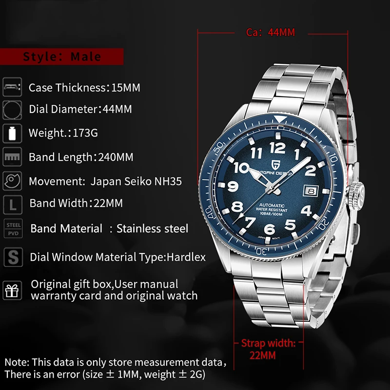 Часы наручные PAGANI Мужские механические, брендовые автоматические водонепроницаемые светящиеся, для дайвинга NH35, 44 мм, 10 бар