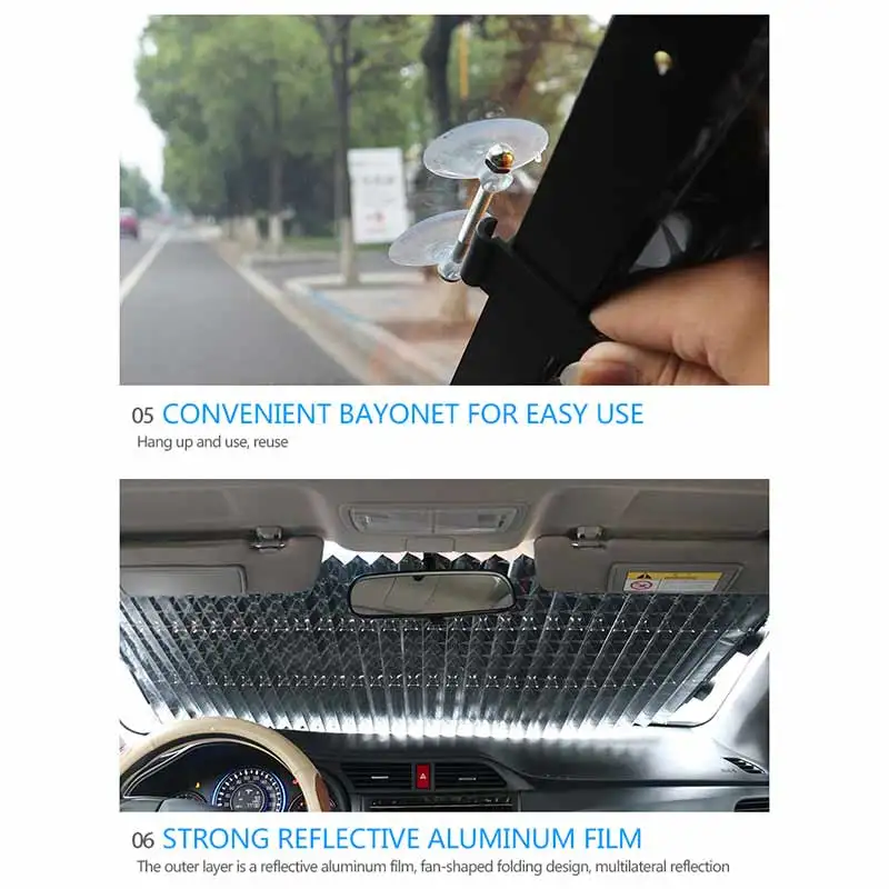 -Элегантный, красивый и практичный серебристый или черный дизайн, сохраняет интерьер автомобиля прохладным и комфортным летом;