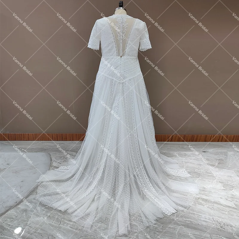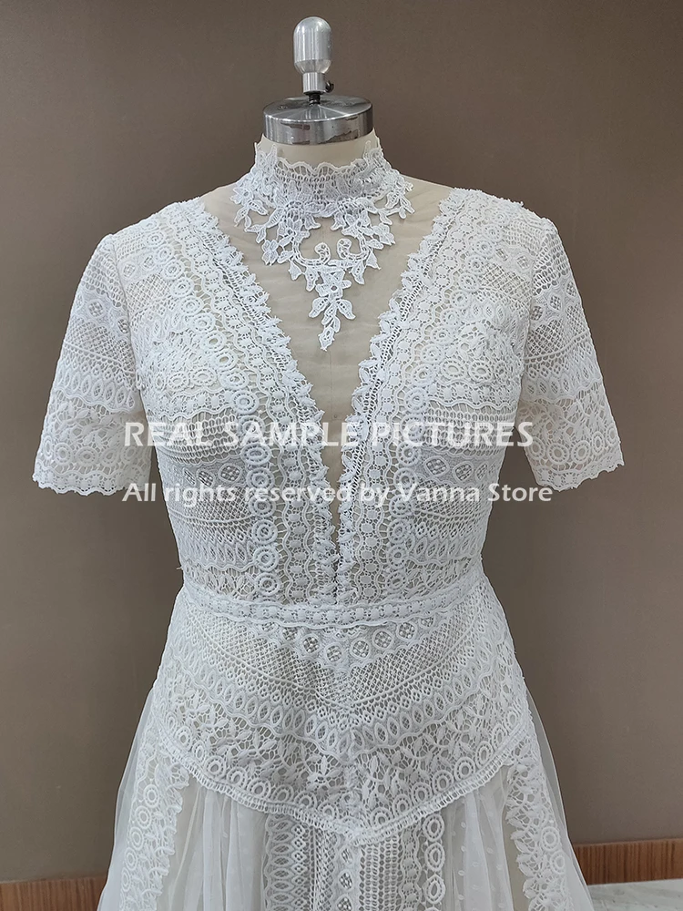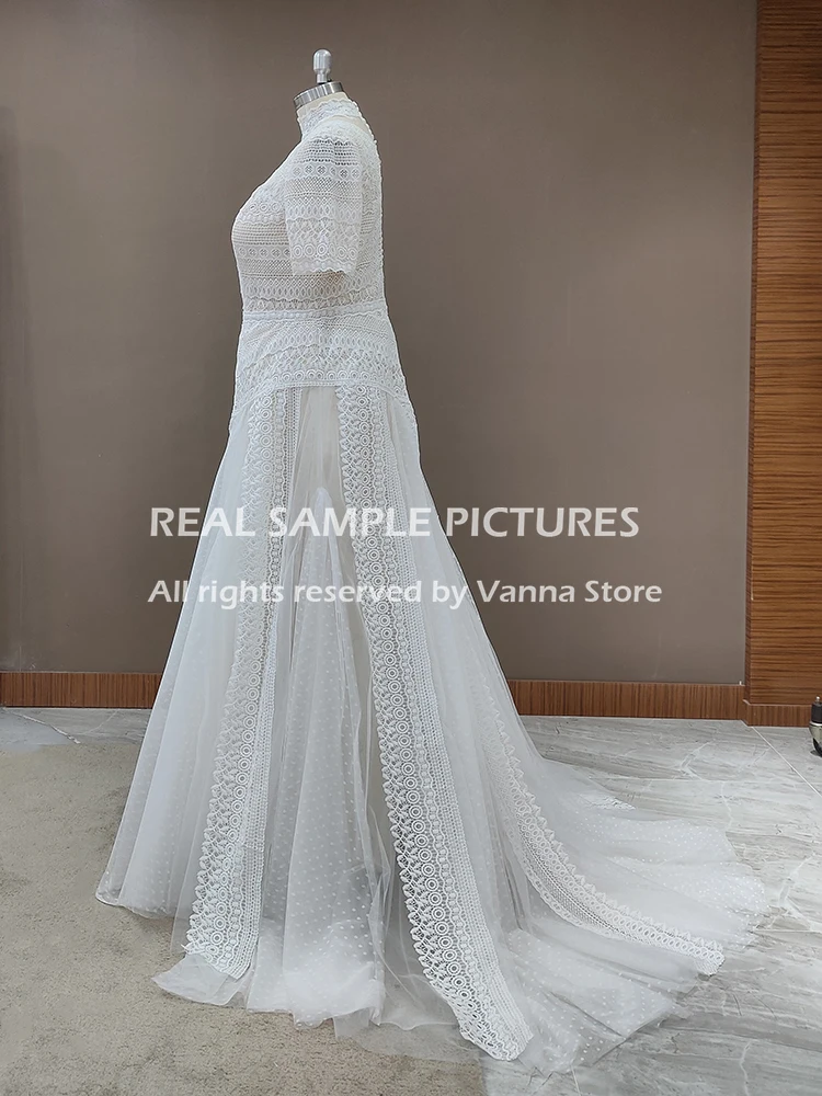 Реальные фотографии, свадебное платье в арабском стиле с коротким рукавом, большие размеры, изготовленное на заказ, с высоким воротником, Ажурные кружевные мусульманские свадебные платья в стиле бохо