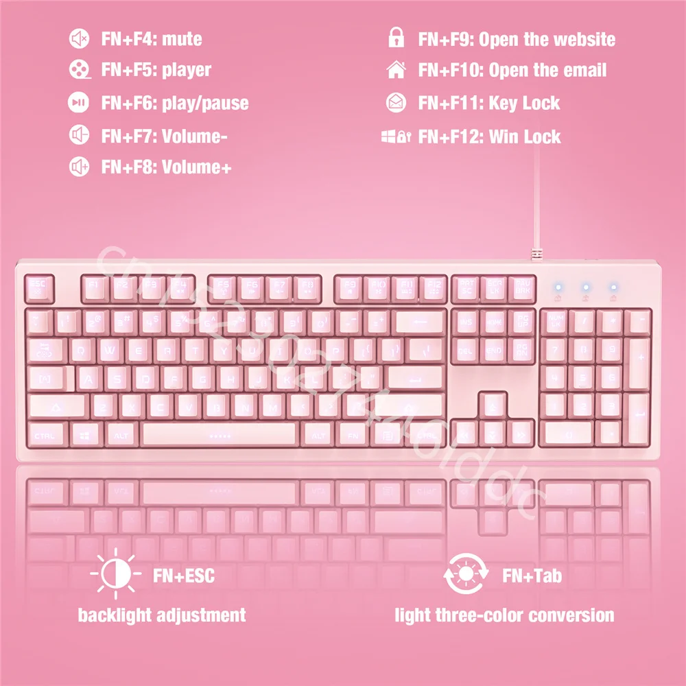CW905 розовая мышь:DPI по умолчанию: 800 зеленый/1600 розовый/2400 синий/3200красный/4800 голубой/6400 желтыйСветильник Цвет: разноцветный "Красный-зелёный-желтыйИнтерфейс: USBДлина кабеля: около 1,5 мВес: около 131 гРазмер изделия: 125*76*41 ммСветильник для мышиСветильник: Нажмите и удерживайте Левую кнопку, затем нажмите DPI-кнопку для переключенияСветильник: Нажмите и удерживайте колесо, затем нажмите кнопку DPI + для переключенияG25 розовая игровая клавиатура:Мембранная клавиатура, 104 кнопки белый светодиодныйИнтерфейс: Проводной USBРазмеры: (длина) 444 мм x (ширина) 139,8 мм x (высота) 42,2 ммВес: 58 5g ± 5gЦвет: розовыйИспользование: ПК, ноутбук, планшет