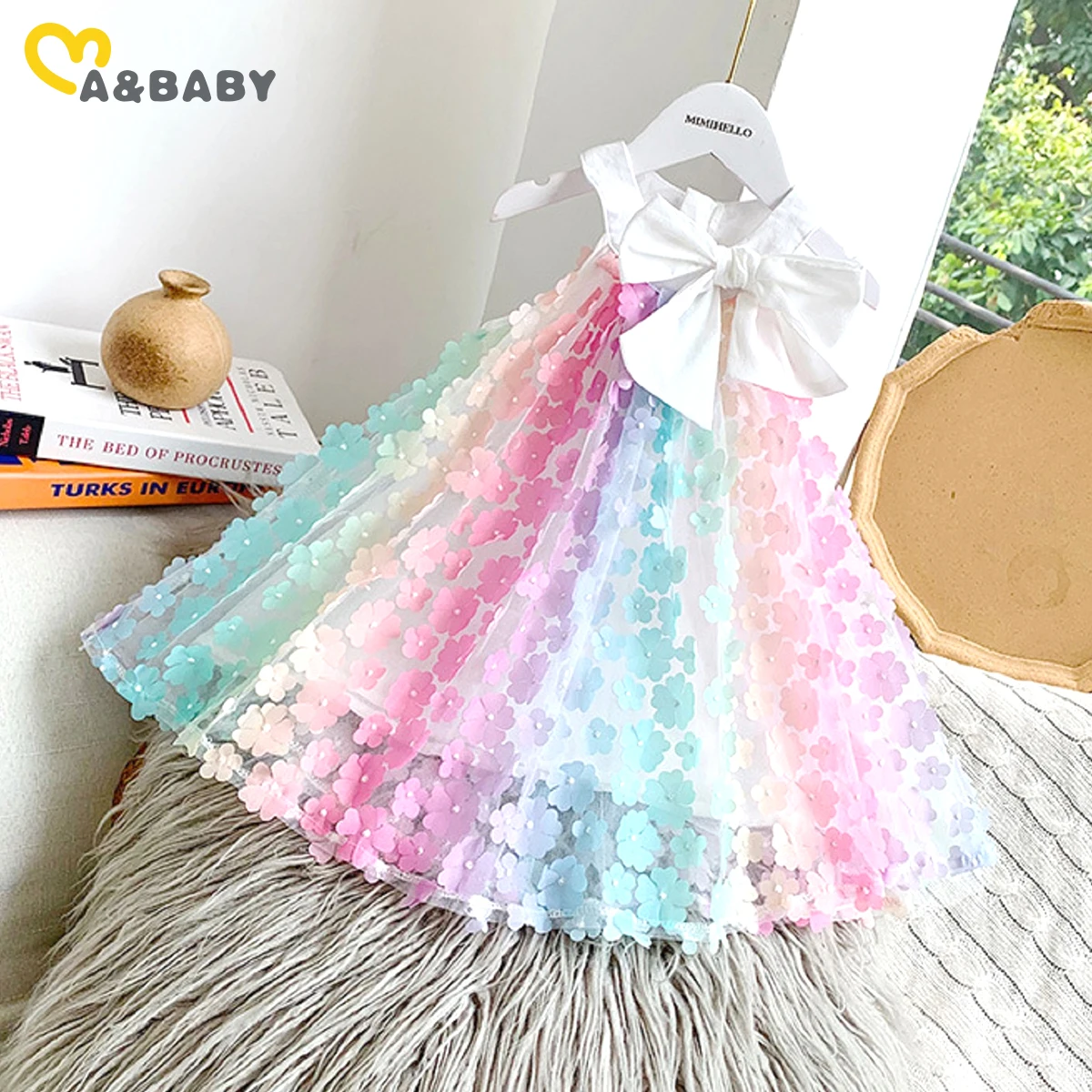 Ma и младенцев от 2 до 7 лет, на лето, для маленьких детей, Платье с цветочным рисунком для девочек с радужным бантом платья трапециевидной формы для маленьких девочек подарок на день рождения костюмы DD43