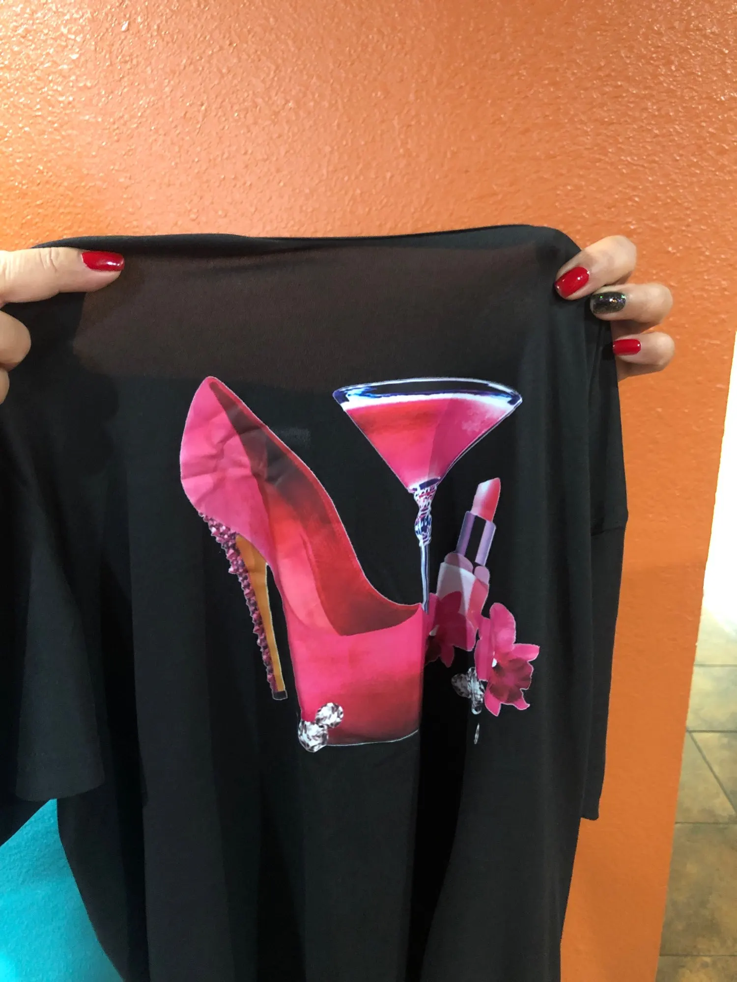 Футболка хорошая, приятная к телу. Довольно свободная, тоненькая. Описанию соответствует. Единственное, я думала, что искрящийся бокал имеет настоящие блёстки, но это просто рисунок. Жаль, но в носке и стирке это, конечно, удобнее.