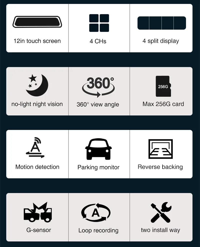 Автомобильный видеорегистратор, 12 дюймов, 4 камеры, запись ночного видения, сенсорный экран 360 градусов, умные зеркальные видеорегистраторы 4 Разделенный экран