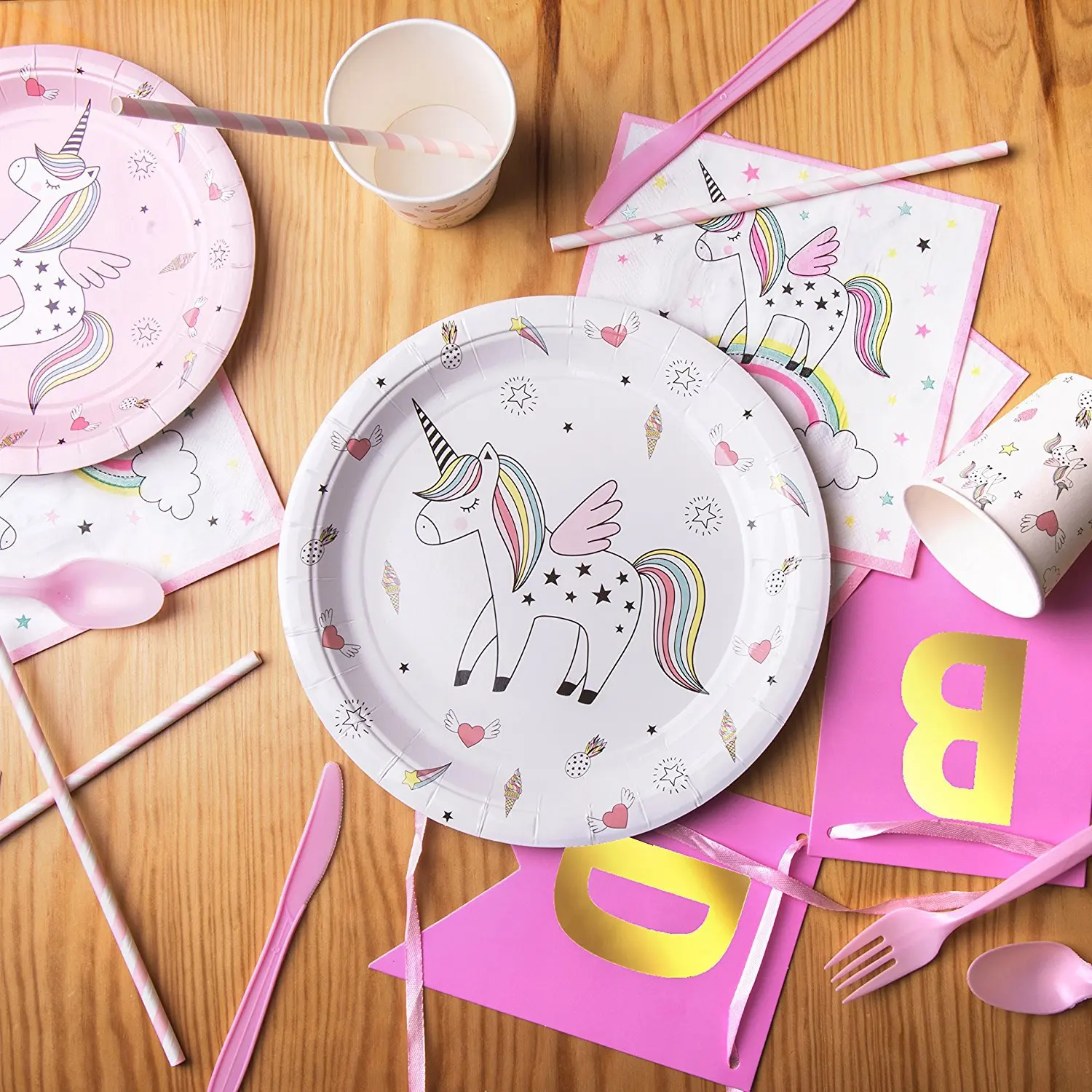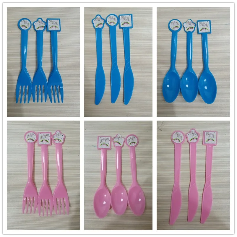 Набор розовых разноцветных одноразовых столовых приборов в виде единорога