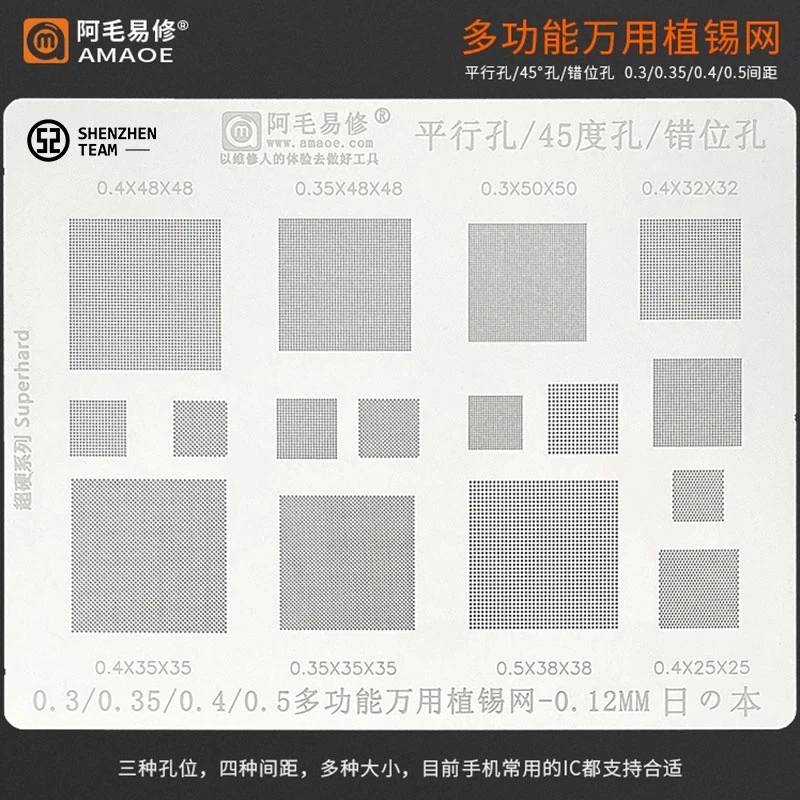 Многофункциональный Универсальный трафарет AMAOE для реболлинга BGA, трафарет для параллельного отверстия 0,3 0,35 0,4 0,45 мм, отверстие 45 градусов, невыровненное отверстие