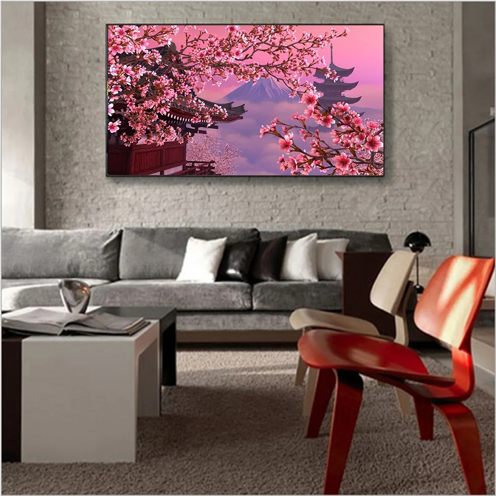 Картина на холсте, 5d, алмазная, полностью квадратнаякруглая, с креплением, Фудзи, вишня, вышивка, мозаика, домик, Сакура, пейзаж, головоломка