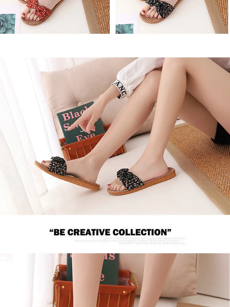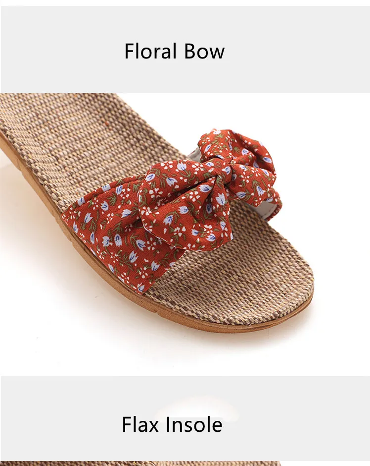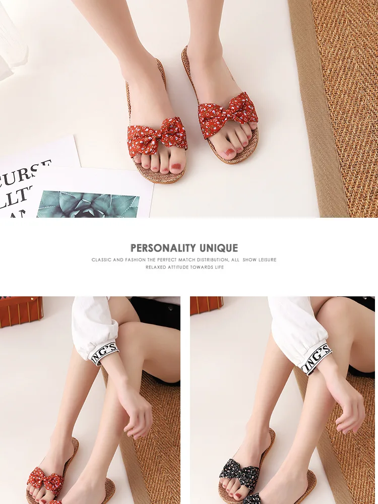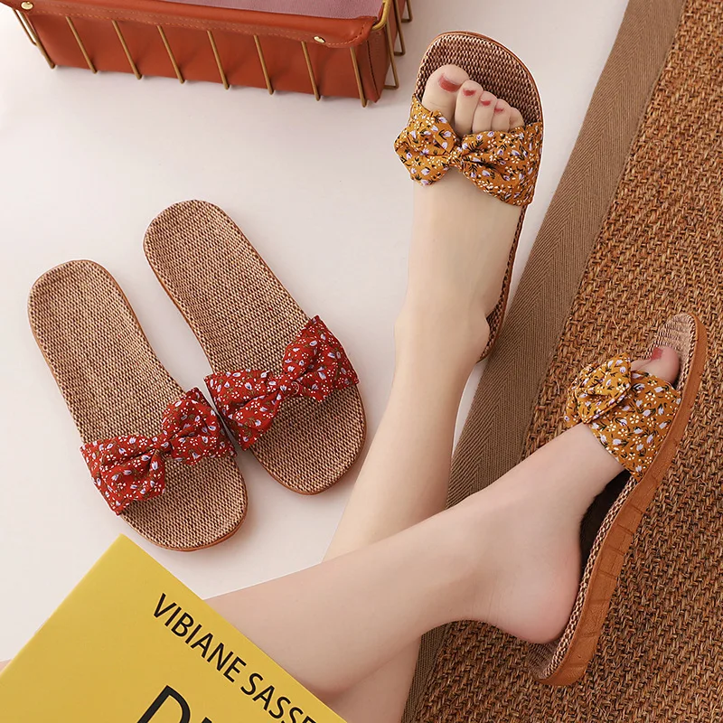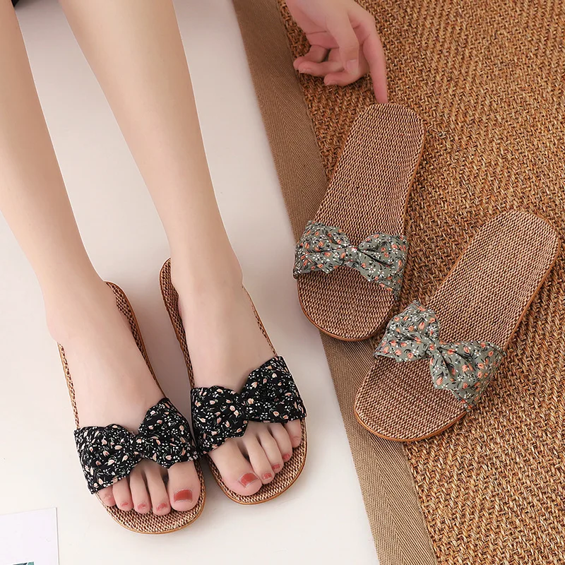 Suihyungлетние тапочки с цветочным принтом и бантом для женщин; Новинка; Повседневные шлепанцы для девочек; Льняная домашняя обувь; Вьетнамки; Женские сандалии на плоской подошве