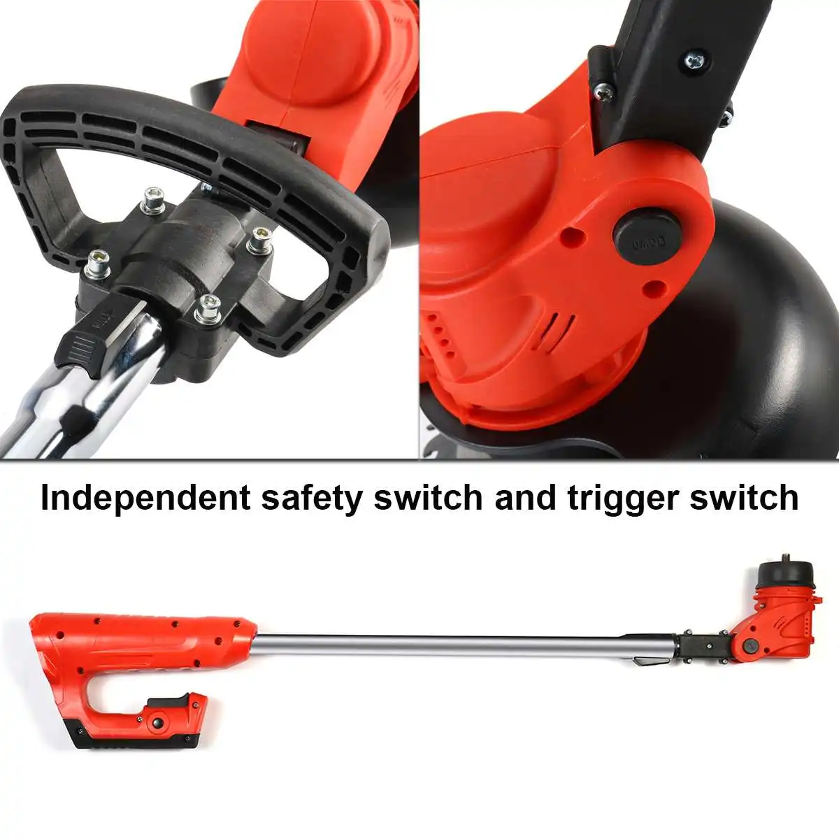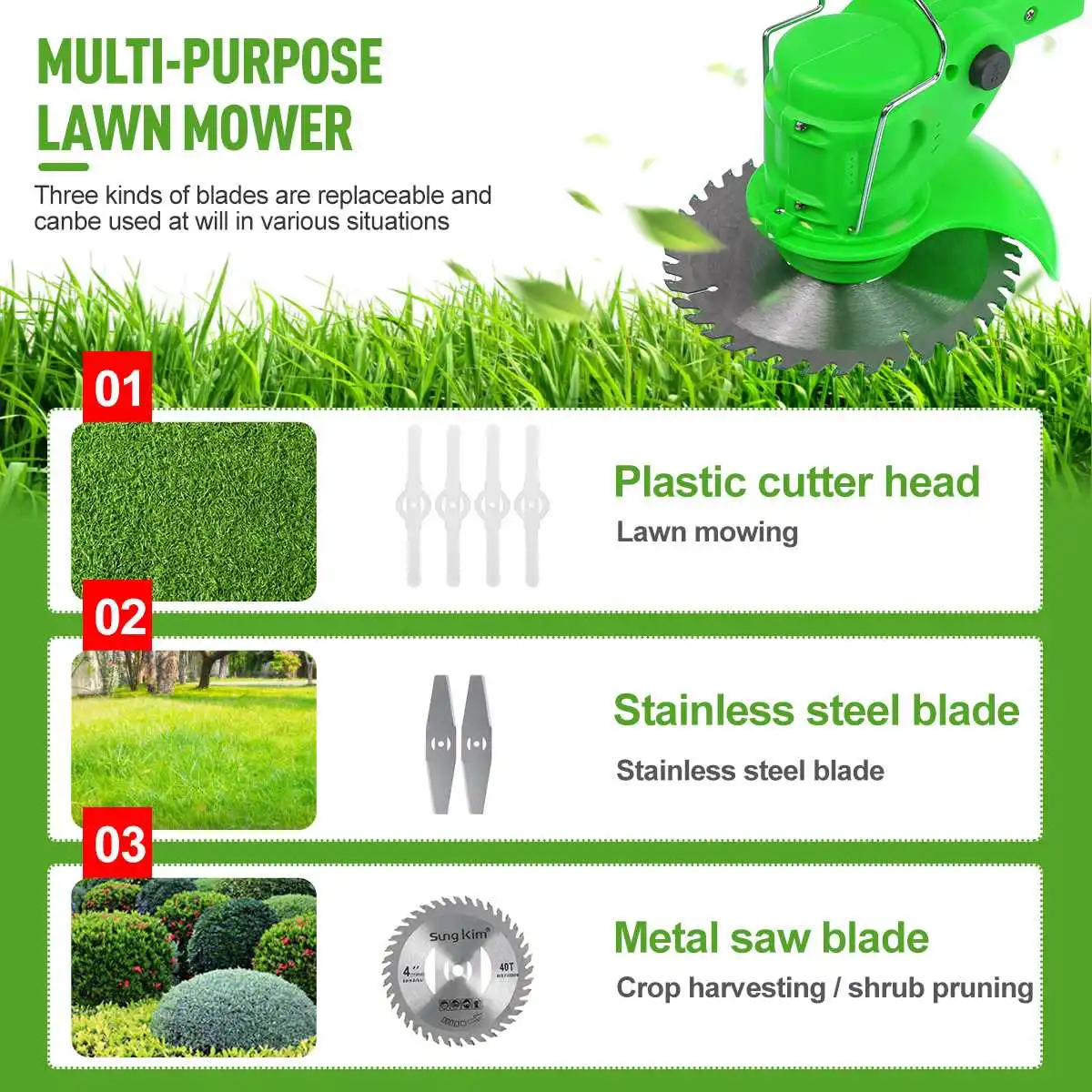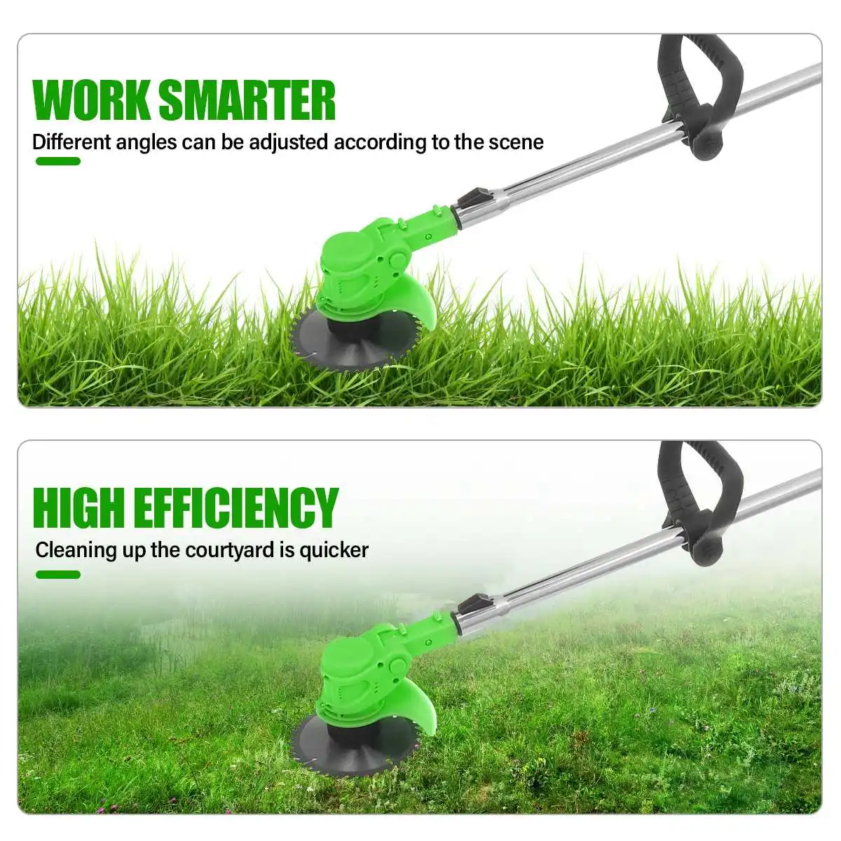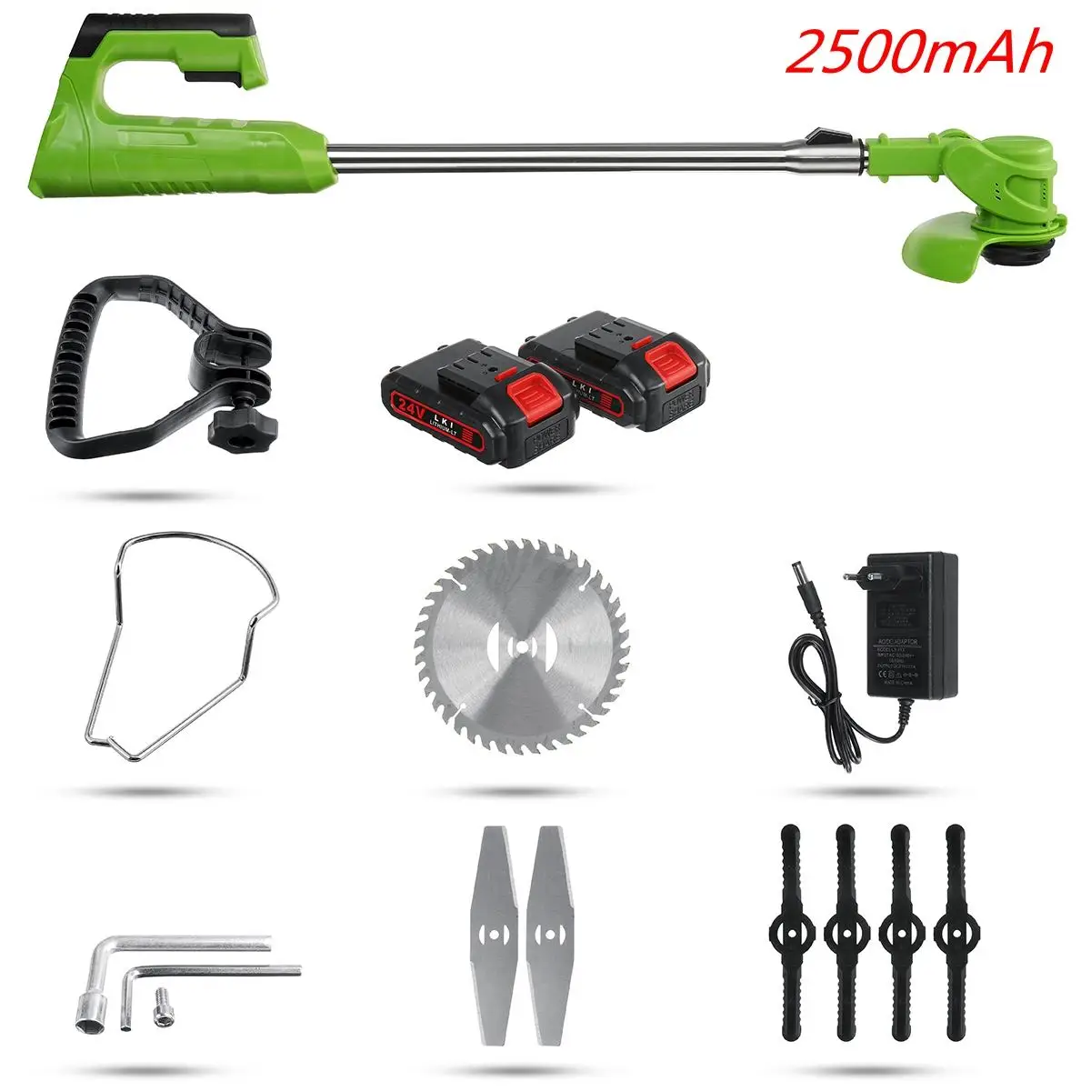 Посылка включает в себя:1 x триммер для травы1 x вспомогательная ручка2 батарейки1 x циркулярная пила1 х стальная проволока3 х гаечный ключ2 x стальное лезвие4 x Пластиковые лезвия1 х адаптер1 x коробкаХарактеристика:● Беспроводной электрический травой тример● Перезаряжаемый● Независимый переключатель безопасности и триггер● Вспомогательная ручка для бесплатной регулировки● Растягивающийся полюс. ОТ 95 см до 130 см● Обновленная съемная защитная крышка для защиты лезвия● Двигатель из чистой меди, мощная Скорость без нагрузки до 25000р/минСпецификация:-Цвет: зеленый, красный (вариант)-Материал: АБС-пластик + алюминий + сталь-Аккумулятор: 21-24 В, 2000-3000 мАч-Время без нагрузки: около 4 часов/6 часов-Время зарядки: 1 час-Скорость без нагрузки: 10000r/min-25000r/мин (макс.)