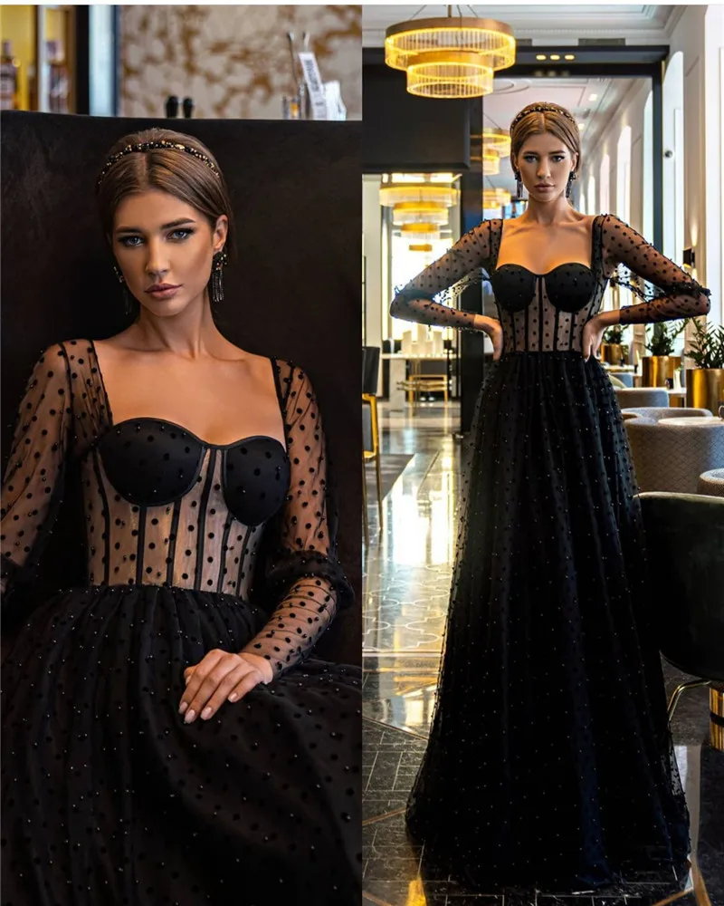 Verngo скромные черные пунктирной линии фатиновые Вечерние платья из жемчуга чистой Одежда с длинным рукавом Милая Вечерние платья с корсетом, для торжественных событий на новогоднюю тематику, раздел