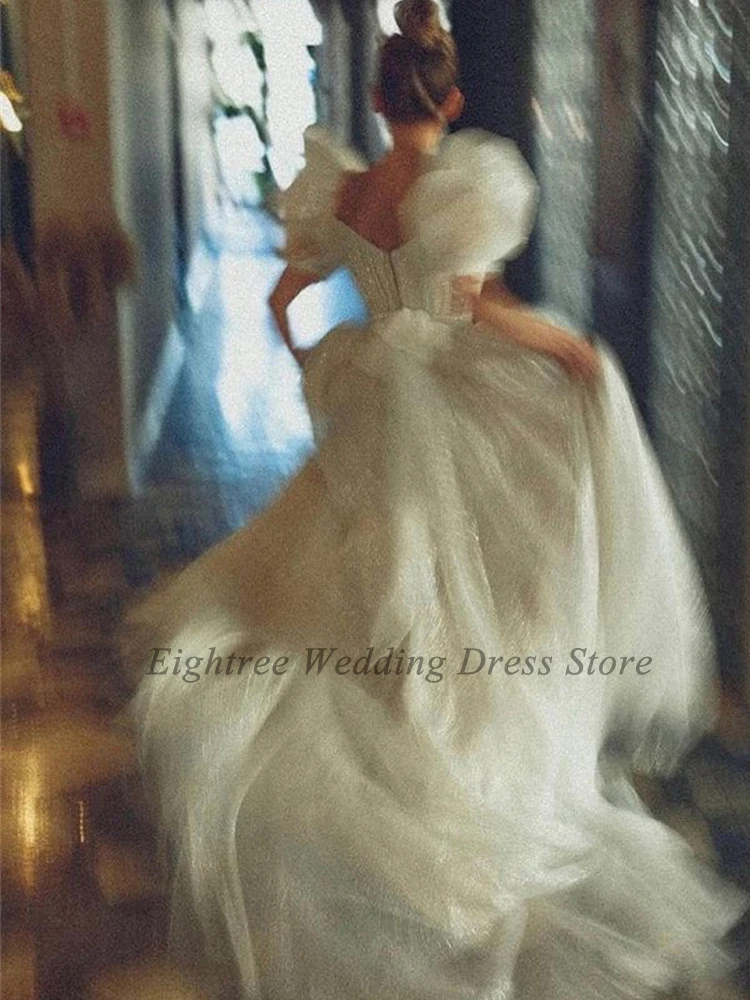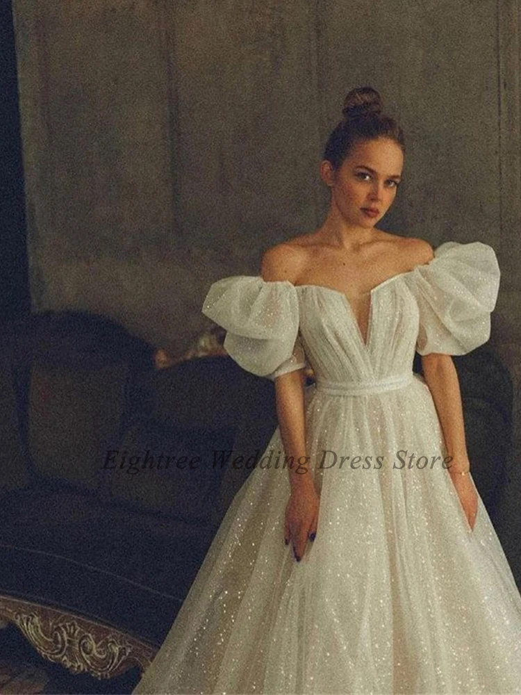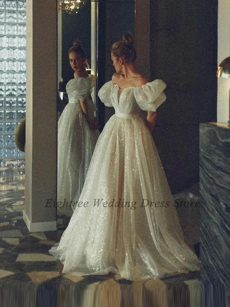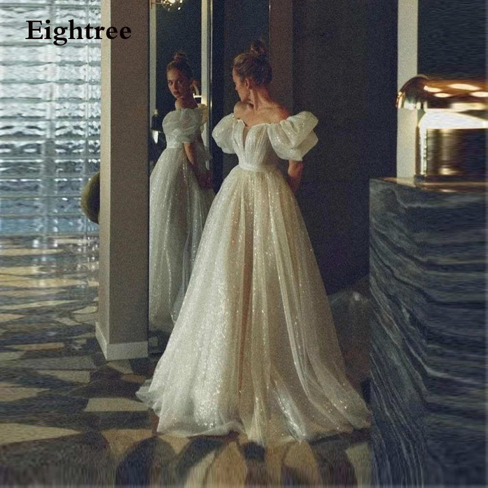Блестящие трапециевидные платья с открытыми плечами для свадебной вечеринки с пышными рукавами и V-образным вырезом Вечерние платья до пола для невесты