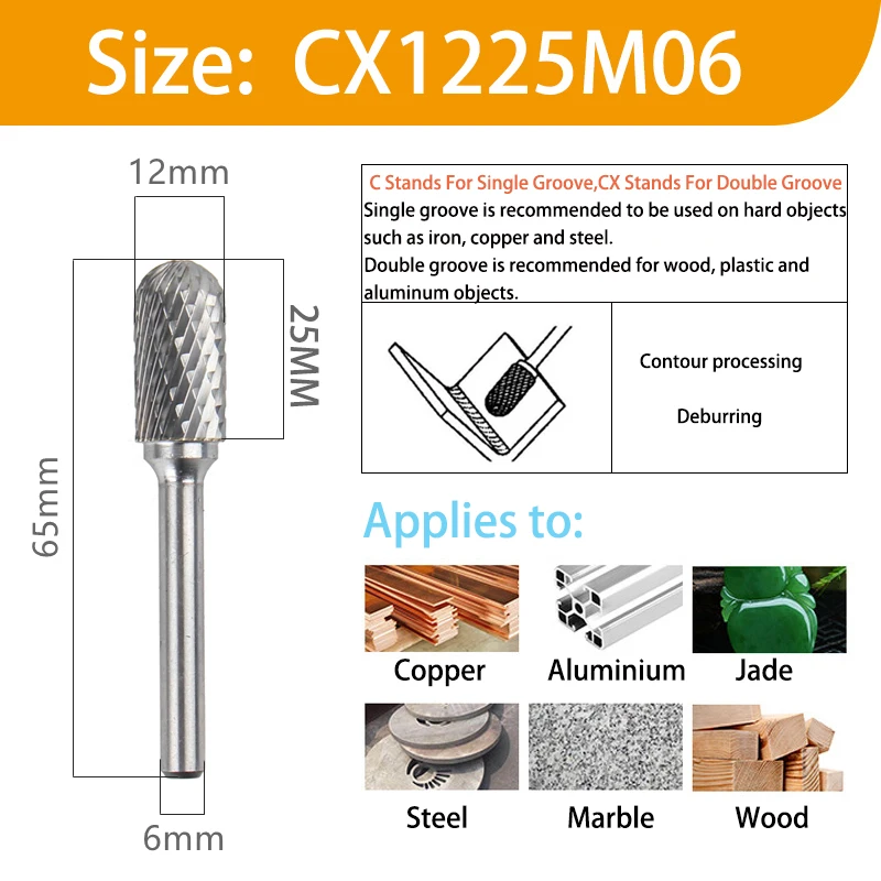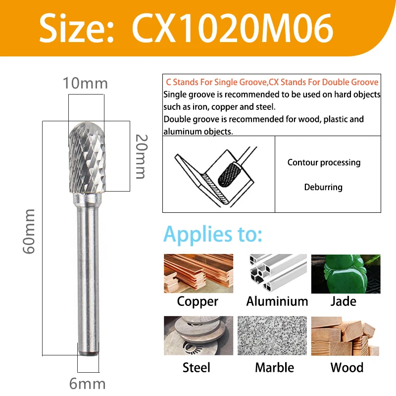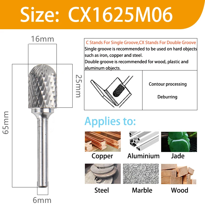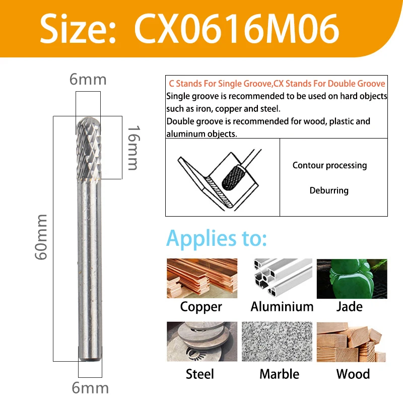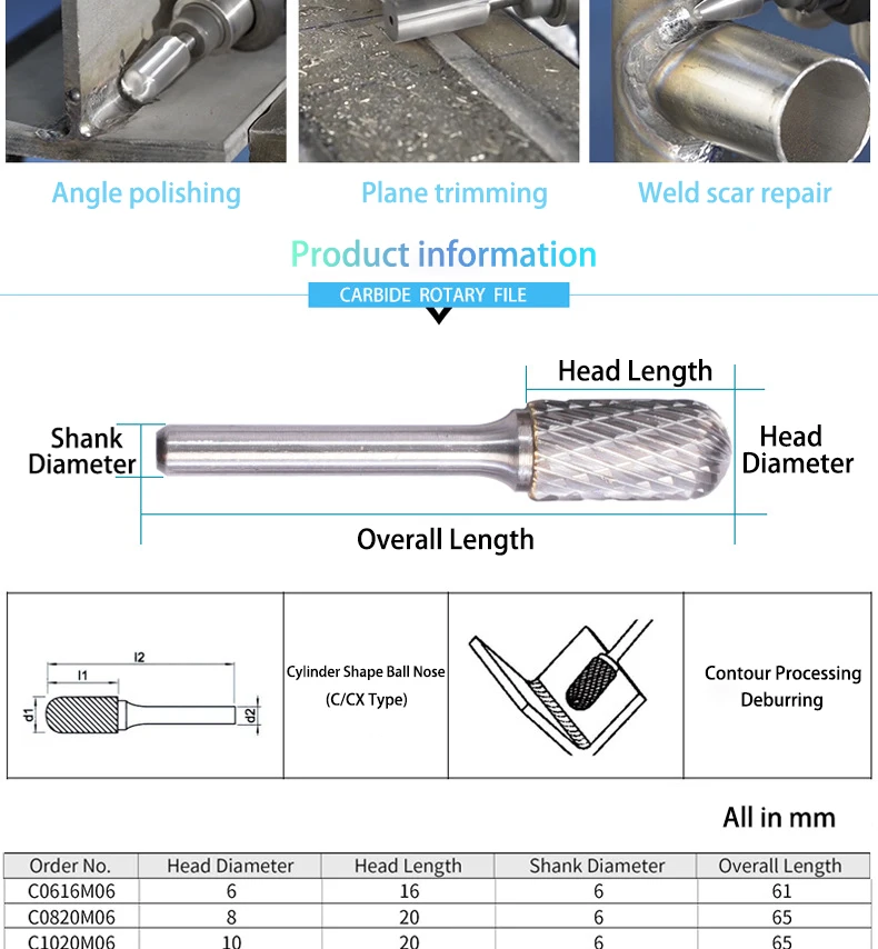 Модель: CX 06 16 M06Стенды CX Для цилиндрической шаровой головки06 представляет внешний диаметр головки.16 представляет длину кромки режущей головки.M06 представляет Диаметр шлифовального стержня.Материал шлифовальной головки: Вольфрам YG8Материал ручки: хромированная стальПАЗ: один паз/двойной пазФорма хвостовика: круглая