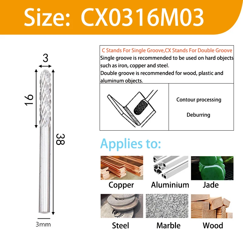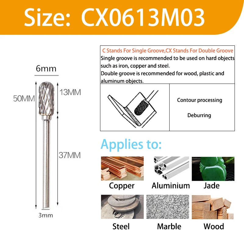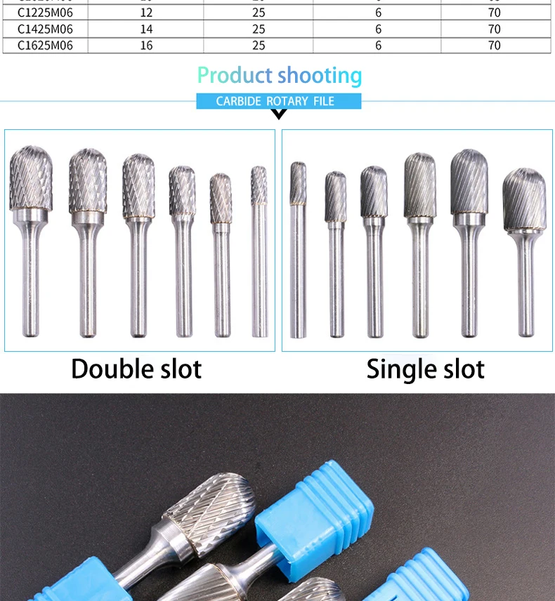 Рекомендуется использовать один паз на твердых предметах, таких как железо, медь и сталь.Двойной паз рекомендуется для деревянных, пластиковых и алюминиевых предметов.Особенности:1. Использование твердосплавного роторного файла чрезвычайно широко распространено, применяется в производстве пресс-форм. Детали Машины конические края, перевернутый круглый и траншеи обработки.2. Может быть обработан чугуном, литой стали, углеродистой стали, легированной стали, нержавеющей стали, меди, алюминия и других металлов, мрамора, нефрита, кости и других неметаллических.3. Широко используется в машиностроении, автомобилях, судостроении, химической, ремесленной скульптуре и т. д.4. Хорошее качество обработки, высокая отделка, длительный срок службы. Может обрабатывать различные высокоточные формы полости.5. Легко захватывается, прост в использовании, безопасен и надежен. Уменьшает тяжелую ручную рабочую силу значительно, снижает стоимость производства.6. Твердосплавный поворотный файл основной поддержки использования электрического инструмента или пневматического инструмента (может также установить на станке)