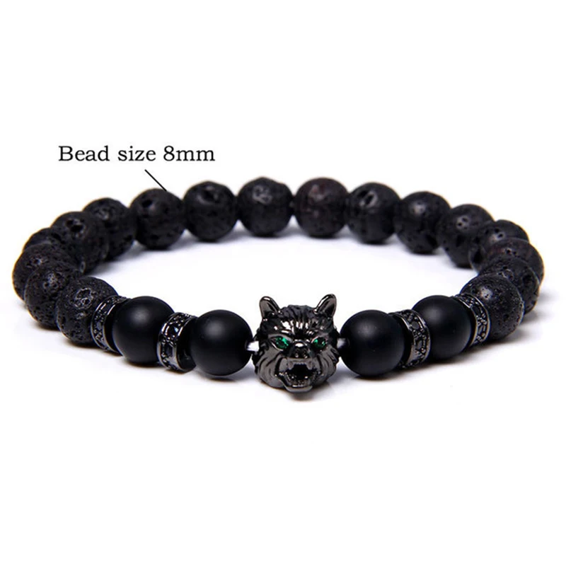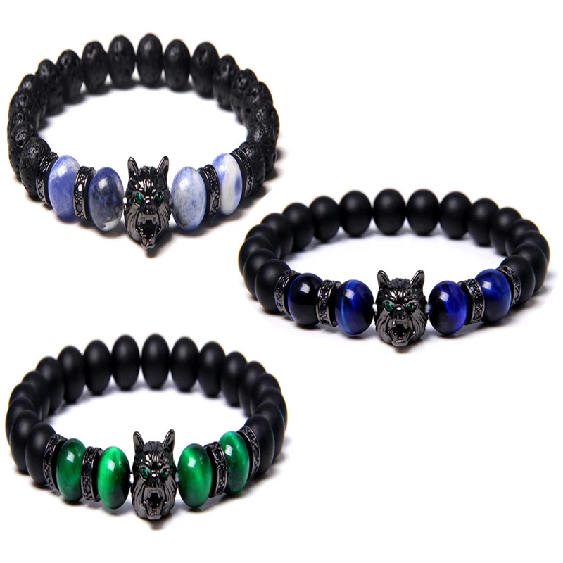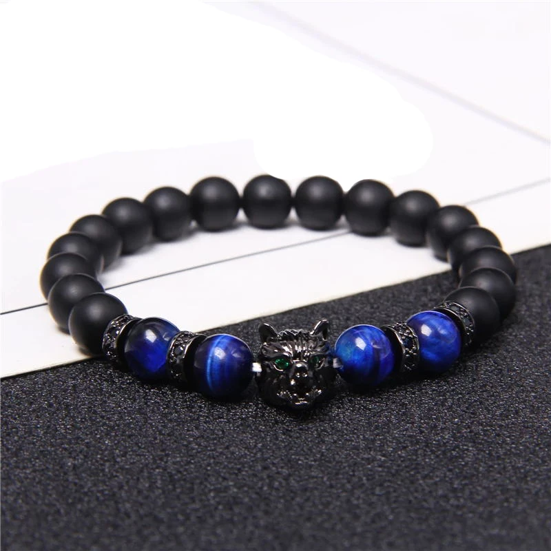 Новый ручной работы из бисера браслет Для мужчин с природным драгоценным камнем голубой тигровый глаз из бисера браслет черный волк головной убор бижутерия Энергетический Браслет