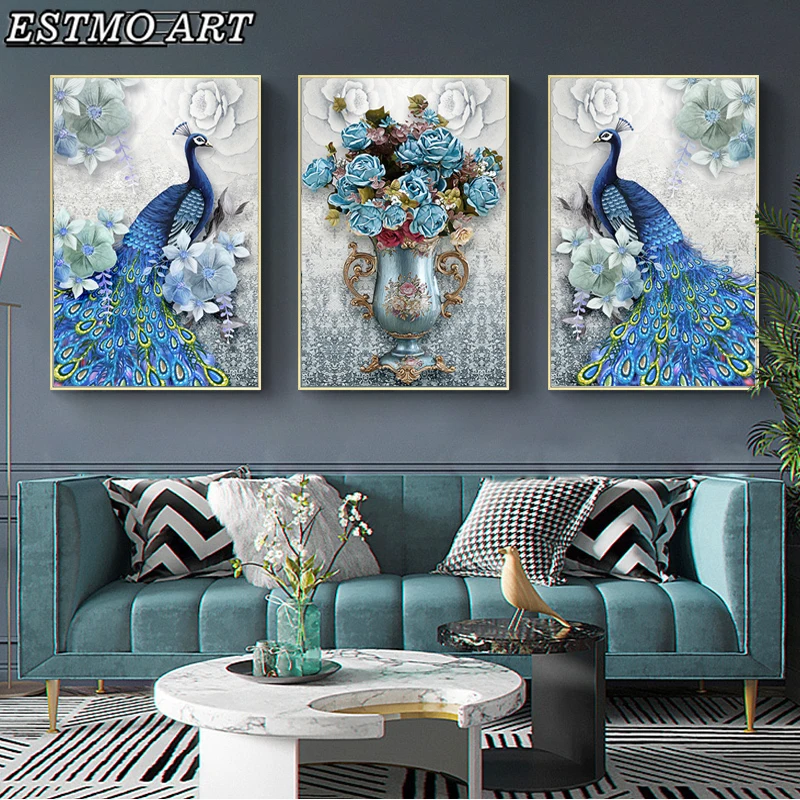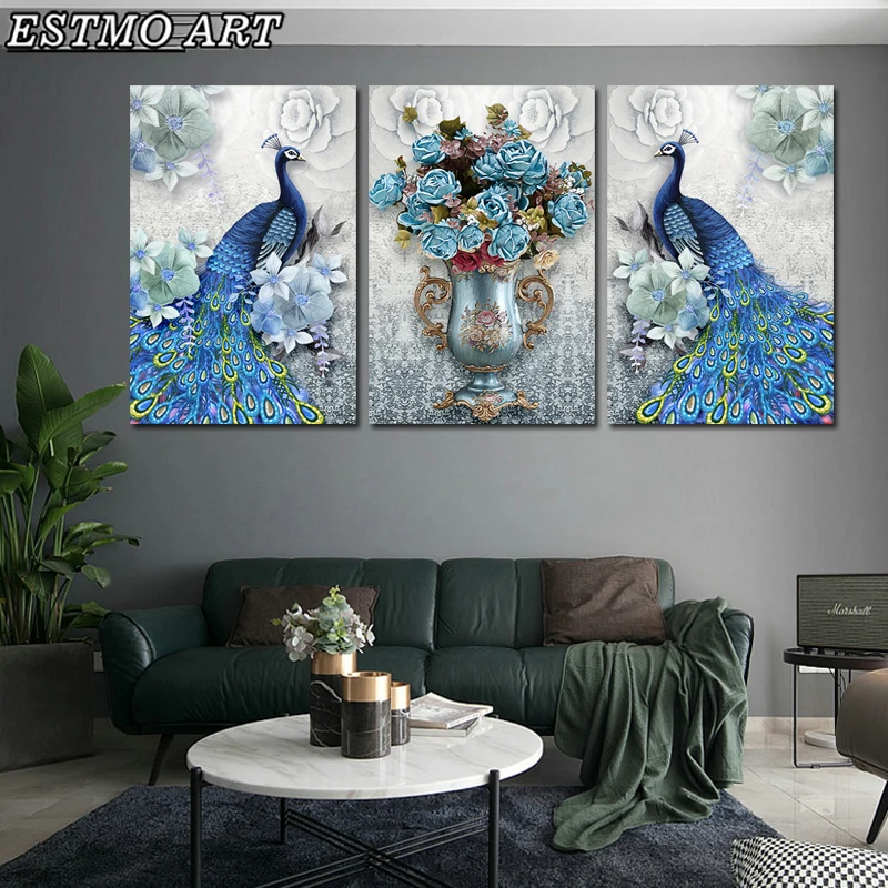 Набор картин на холсте, ваза с синим павлином и цветами, 3 шт.