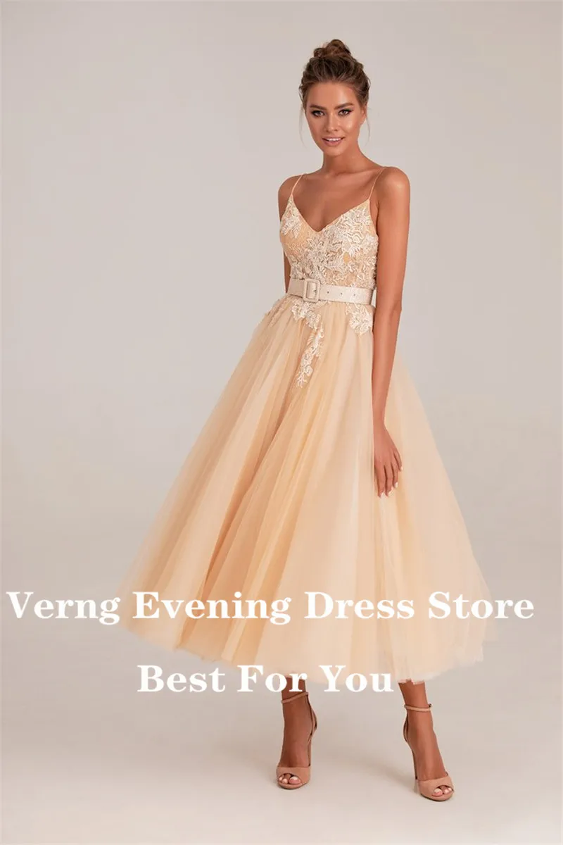 Verngo 2021 Новая коллекция кружево Аппликация Vestido De Festa Тюль трапециевидной формы Выпускные платья на бретельках, с поясом, на лодыжке Длина Бальные вечерние платья