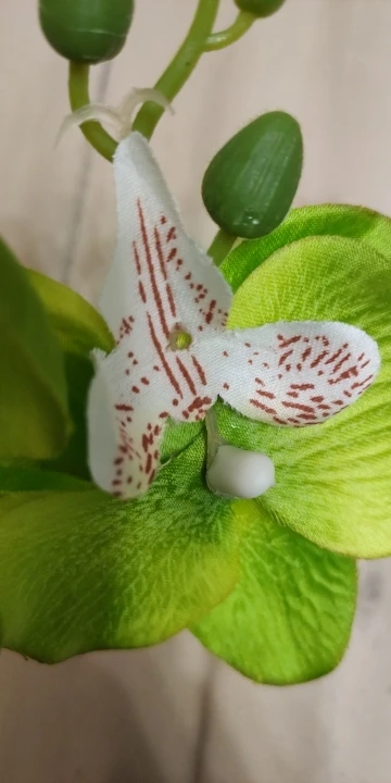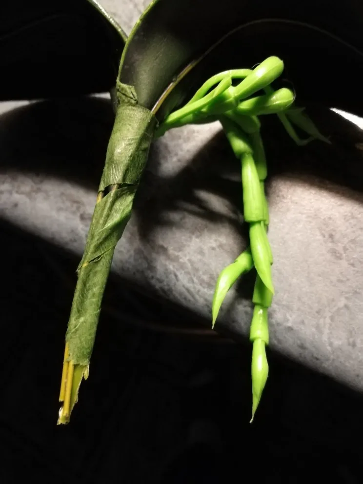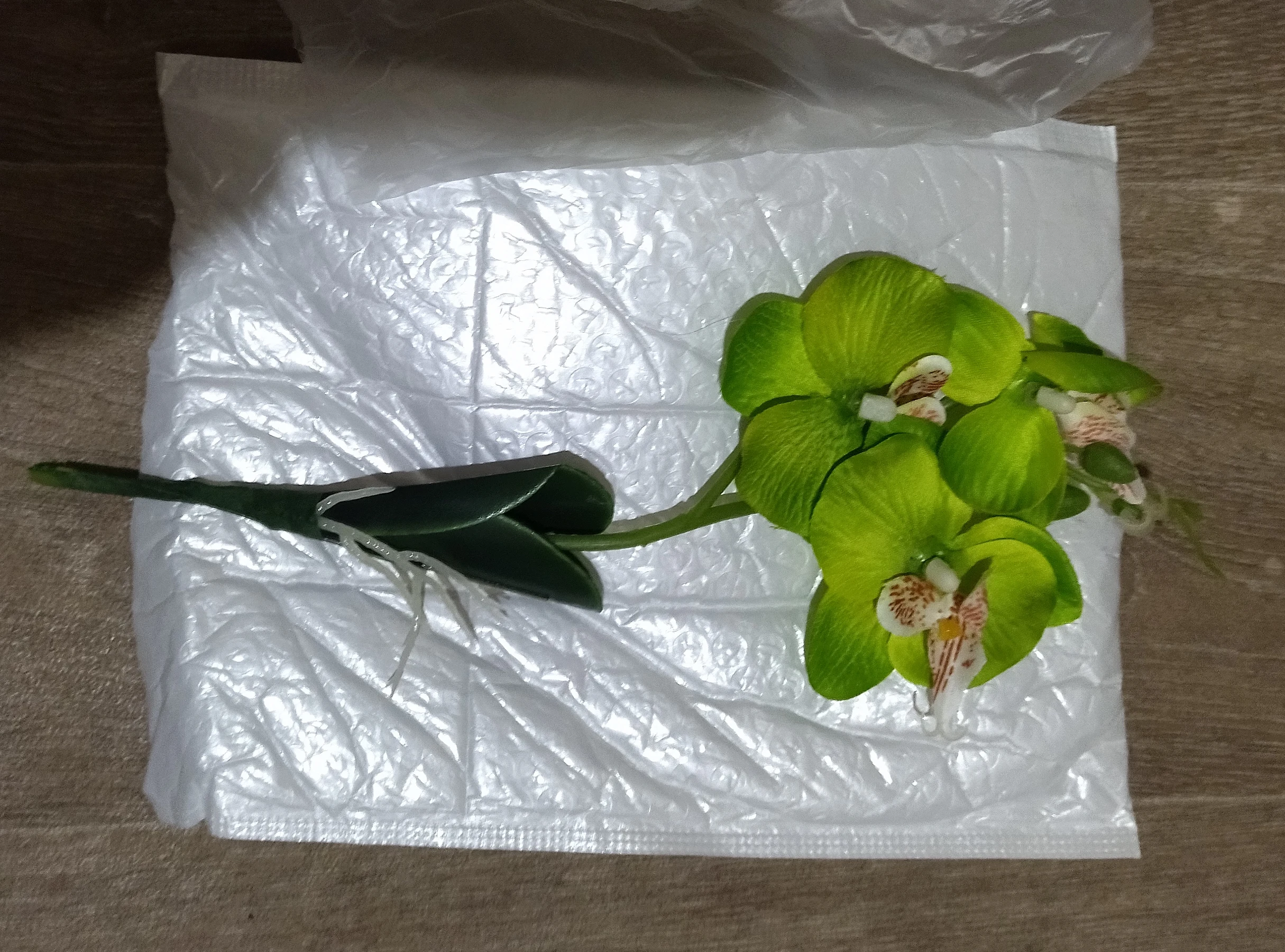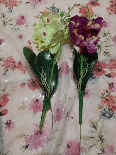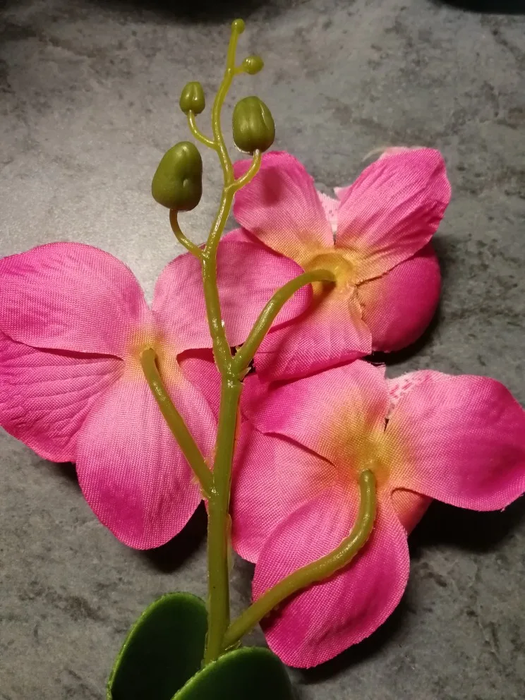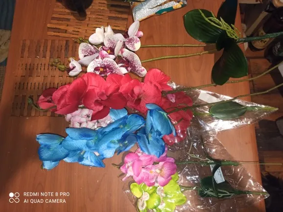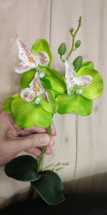 Веточка совсем небольшая, чуть больше ладони, на ветке 3 цветка, на верхушке несколько пластиковых бутонов, внизу 2 листа и забавное подобие корешков. Прислали быстро, за две недели, трек отслеживался, упаковано в обычный целлофановый конверт без какой-либо защиты, цветки помяты, местами были остатки клея. Клей убрала, цветы обработала отпаривателем, более-менее стал нормально смотреться. На мой взгляд, можно купить что-то подороже, длиннее и с бо́льшим количеством цветов на ветке, смотреться будет лучше.