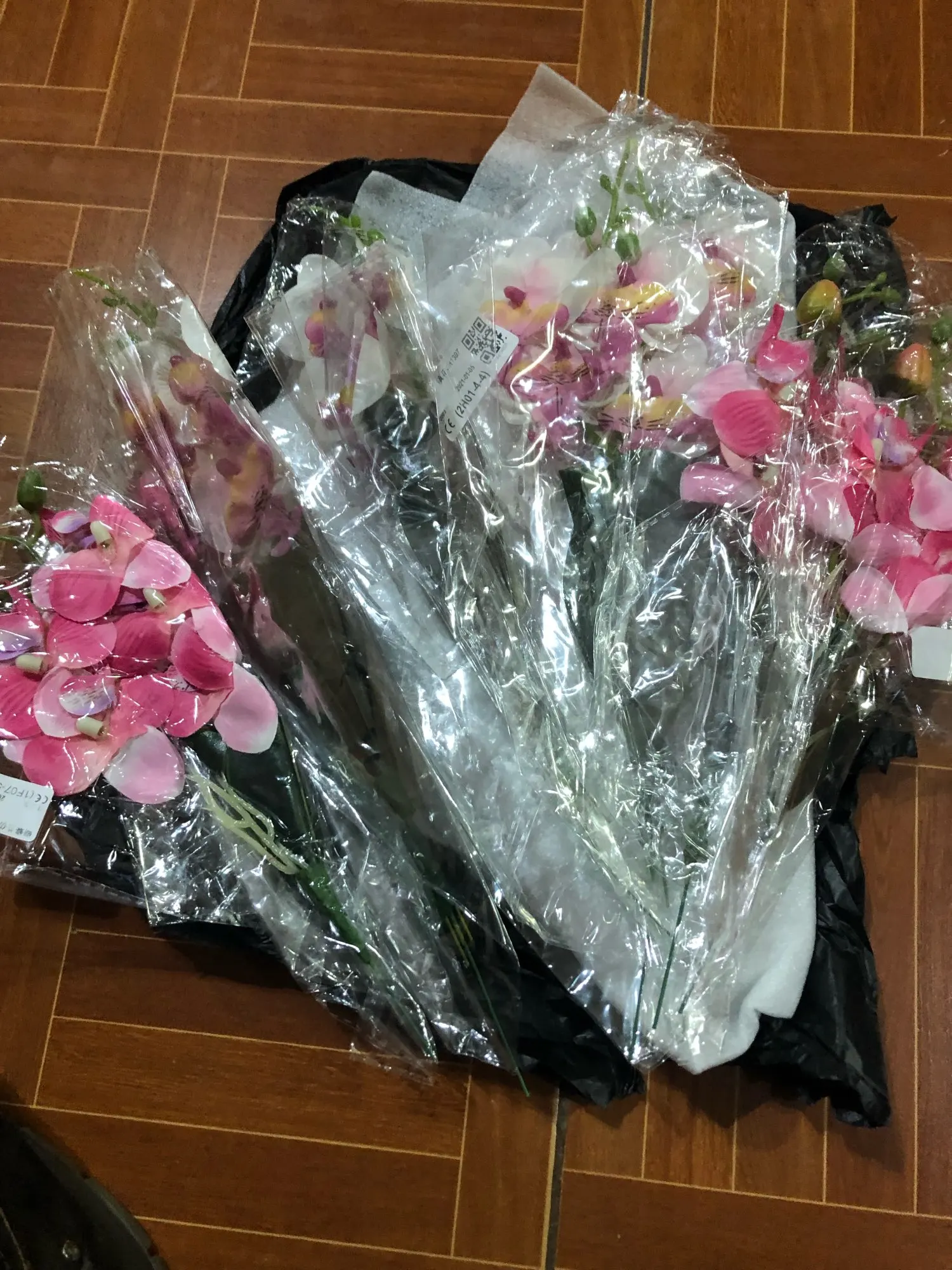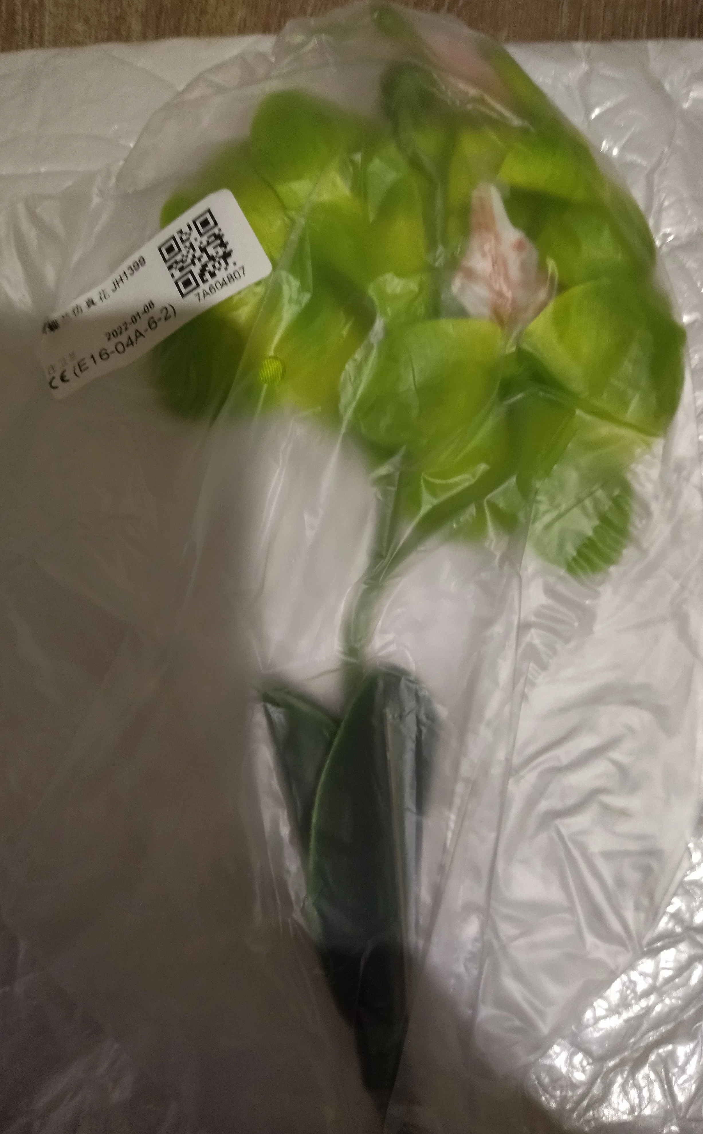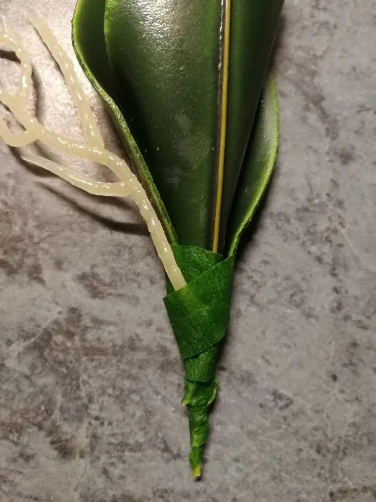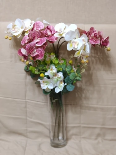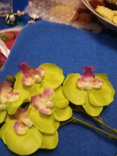 Веточка совсем небольшая, чуть больше ладони, на ветке 3 цветка, на верхушке несколько пластиковых бутонов, внизу 2 листа и забавное подобие корешков. Прислали быстро, за две недели, трек отслеживался, упаковано в обычный целлофановый конверт без какой-либо защиты, цветки помяты, местами были остатки клея. Клей убрала, цветы обработала отпаривателем, более-менее стал нормально смотреться. На мой взгляд, можно купить что-то подороже, длиннее и с бо́льшим количеством цветов на ветке, смотреться будет лучше.