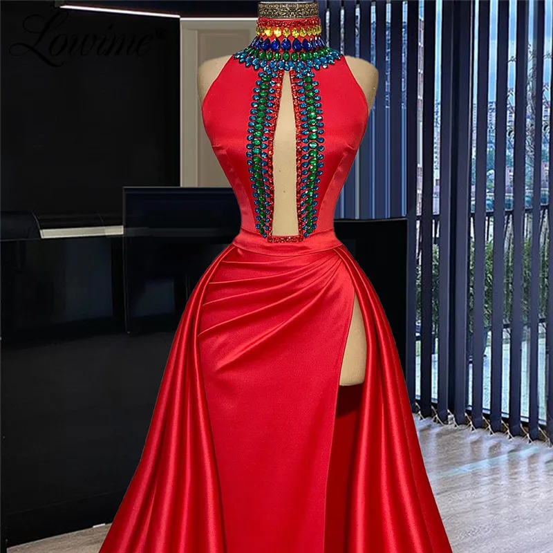 Женское атласное платье Lowime, Красное длинное платье для выпускного вечера, с кристаллами, 2021, размера плюс