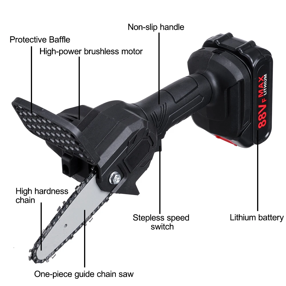Особенности:-С защитной перегородкой, предотвращает брызги опилок во время процесса резки.-Эргономичная ручка, которая очень удобна и безопасна для переноски.-Безопасность пилы, эффективно повышает эффективность вашей работы.-Цепи пилы закаливают, закаляют и отжигают. Они долговечны, чем обычные цепи пилы.-Маленький размер, можно держать одной рукой.-Светильник вес тела, светильник и удобный, светильник вес конструкции, долгое время хранения и не устают руки.-Двигатель из чистой меди, сильная мощность, быстрая резка, повышение эффективности.-Практичная, быстрая скорость, низкое энергопотребление.-Переключатель отличного качества, быстрая и медленная регулировка, плавное изменение скорости.